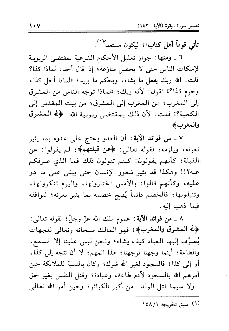 ٧ ــ من فوائد الآية: أن العدو يحتج على عدوه بما يثير نعرته، ويلزمه؛ لقوله تعالى: {عن قبلتهم}؛ لم يقولوا: عن القبلة؛ كأنهم يقولون: كنتم تتولون ذلك فما الذي صرفكم عنه؟!! وهكذا قد يثير شعور الإنسان حتى يبقى على ما هو عليه، وكأنهم قالوا: بالأمس تختارونها، واليوم تنكرونها، وتنبذونها؛ فالخصم دائماً يُهيج خصمه بما يثير نعرته؛ ليوافقه فيما ذهب إليه.