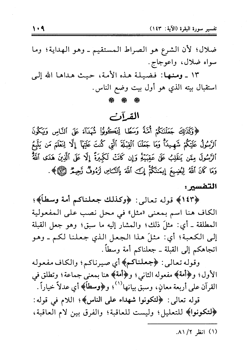 {١٤٣} قوله تعالى: {وكذلك جعلناكم أمة وسطاً}؛ الكاف هنا اسم بمعنى «مثل» في محل نصب على المفعولية المطلقة ــ أي: مثلَ ذلك؛ والمشار إليه ما سبق؛ وهو جعل القبلة إلى الكعبة؛ أي: مثلَ هذا الجعل الذي جعلنا لكم ــ وهو اتجاهكم إلى القبلة ــ جعلناكم أمة وسطاً.