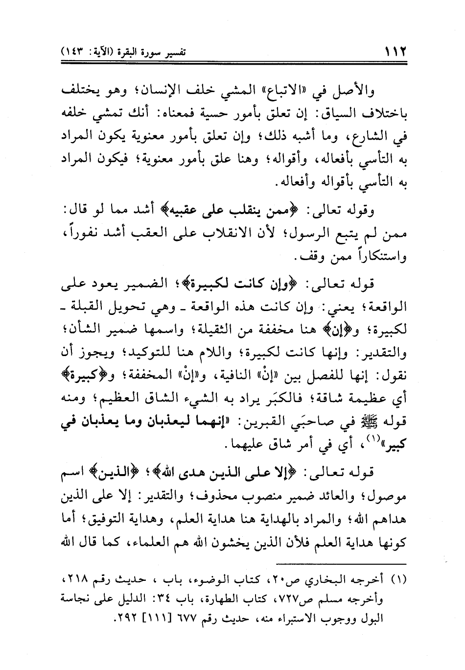 قوله تعالى: {وإن كانت لكبيرة}؛ الضمير يعود على الواقعة؛ يعني: وإن كانت هذه الواقعة ــ وهي تحويل القبلة ــ لكبيرة؛ و {إن} هنا مخففة من الثقيلة؛ واسمها ضمير الشأن؛ والتقدير: وإنها كانت لكبيرة؛ واللام هنا للتوكيد؛ ويجوز أن نقول: إنها للفصل بين «إنْ» النافية، و «إنْ» المخففة؛ و {كبيرة} أي عظيمة شاقة؛ فالكبَر يراد به الشيء الشاق العظيم؛ ومنه قوله صلى الله عليه وسلم في صاحبَي القبرين: «إنهما ليعذبان وما يعذبان في كبير» (¬١)، أي في أمر شاق عليهما.