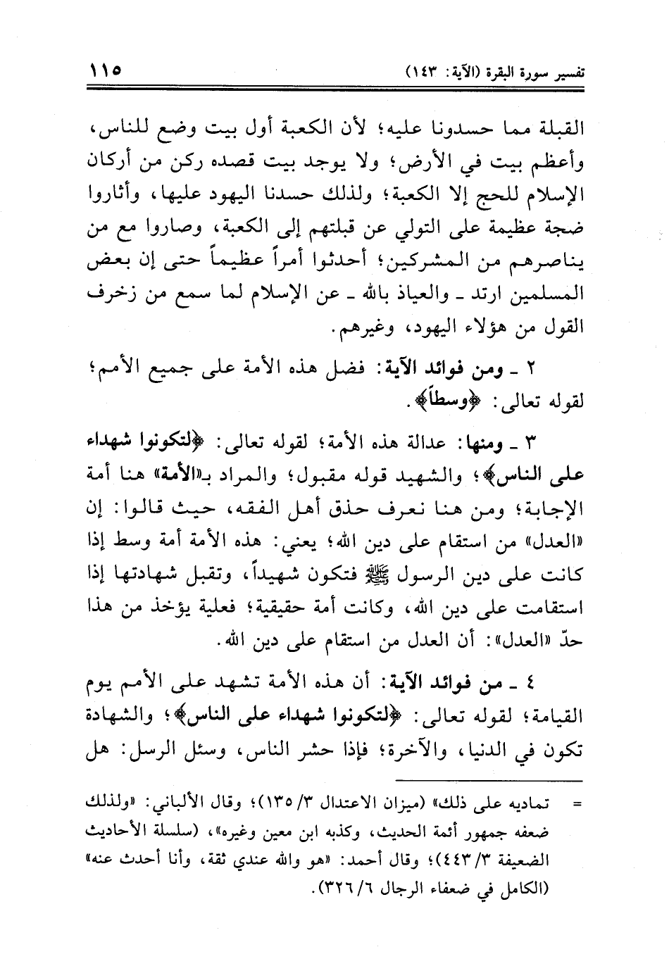 ٣ ــ ومنها: عدالة هذه الأمة؛ لقوله تعالى: {لتكونوا شهداء على الناس}؛ والشهيد قوله مقبول؛ والمراد بـ «الأمة» هنا أمة الإجابة؛ ومن هنا نعرف حذق أهل الفقه، حيث قالوا: إن «العدل» من استقام على دين الله؛ يعني: هذه الأمة أمة وسط إذا كانت على دين الرسول صلى الله عليه وسلم فتكون شهيداً، وتقبل شهادتها إذا استقامت على دين الله، وكانت أمة حقيقية؛ فعليه يؤخذ من هذا حدّ «العدل»: أن العدل من استقام على دين الله.