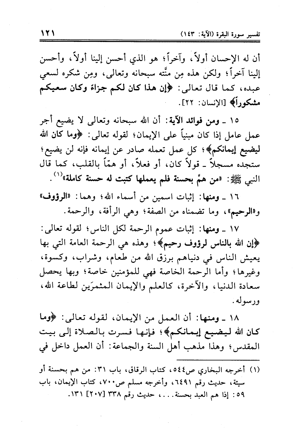 ١٥ ــ ومن فوائد الآية: أن الله سبحانه وتعالى لا يضيع أجر عمل عامل إذا كان مبنياً على الإيمان؛ لقوله تعالى: {وما كان الله ليضيع إيمانكم}؛ كل عمل تعمله صادر عن إيمانه فإنه لن يضيع؛ ستجده مسجلاً ــ قولاً كان، أو فعلاً، أو همّاً بالقلب، كما قال النبي صلى الله عليه وسلم: «من همَّ بحسنة فلم يعملها كتبت له حسنة كاملة» (¬١).