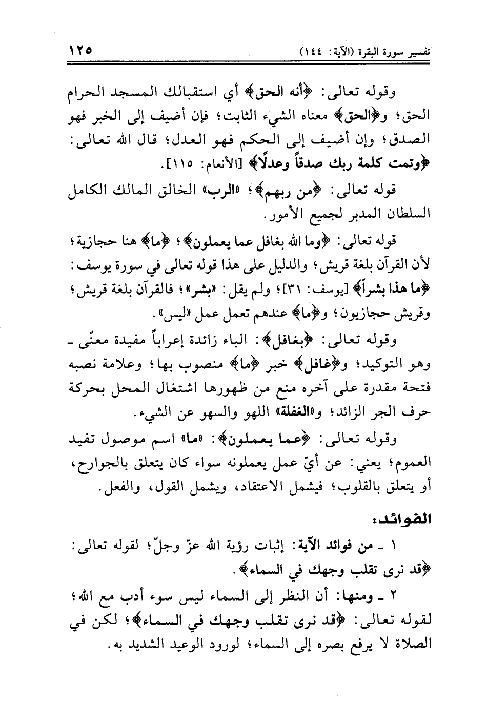 ١ ــ من فوائد الآية: إثبات رؤية الله عزّ وجلّ؛ لقوله تعالى: {قد نرى تقلب وجهك في السماء}.