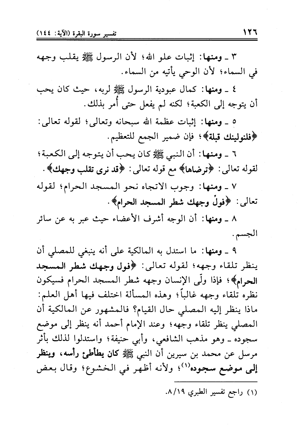 ٩ ــ ومنها: ما استدل به المالكية على أنه ينبغي للمصلي أن ينظر تلقاء وجهه؛ لقوله تعالى: {فول وجهك شطر المسجد الحرام}؛ فإذا ولّى الإنسان وجهه شطر المسجد الحرام فسيكون نظره تلقاء وجهه غالباً؛ وهذه المسألة اختلف فيها أهل العلم: ماذا ينظر إليه المصلي حال القيام؟ فالمشهور عن المالكية أن المصلي ينظر تلقاء وجهه؛ وعند الإمام أحمد أنه ينظر إلى موضع سجوده - وهو مذهب الشافعي، وأبي حنيفة؛ واستدلوا لذلك بأثر مرسل عن محمد بن سيرين أن النبي صلى الله عليه وسلم كان يطأطئ رأسه، وينظر إلى موضع سجوده (¬١)؛ ولأنه أظهر في الخشوع؛ وقال بعض