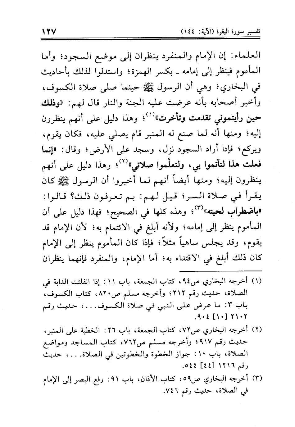 العلماء: إن الإمام والمنفرد ينظران إلى موضع السجود؛ وأما المأموم فينظر إلى إمامه - بكسر الهمزة؛ واستدلوا لذلك بأحاديث في البخاري؛ وهي أن الرسول صلى الله عليه وسلم حينما صلى صلاة الكسوف، وأخبر أصحابه بأنه عرضت عليه الجنة والنار قال لهم: «وذلك حين رأيتموني تقدمت وتأخرت» (¬١)؛ وهذا دليل على أنهم ينظرون إليه؛ ومنها أنه لما صنع له المنبر قام يصلي عليه، فكان يقوم، ويركع؛ فإدا أراد السجود نزل، وسجد على الأرض؛ وقال: «إنما فعلت هذا لتأتموا بي، ولتعلَّموا صلاتي» (¬٢)؛