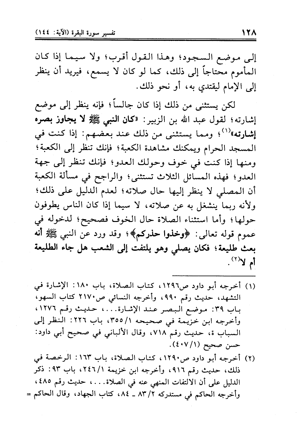 (¬٢) أخرجه أبو داود ص ١٢٩٠، كتاب الصلاة، باب ١٦٣: الرخصة في ذلك، حديث رقم ٩١٦، وأخرجه ابن خزيمة ١/ ٢٤٦، باب ٩٣: ذكر الدليل على أن الالتفات المنهي عنه في الصلاة ... ، حديث رقم ٤٨٥، وأخرجه الحاكم في مستدركه ٢/ ٨٣ - ٨٤، كتاب الجهاد، وقال الحاكم (صحيح على شرط الشيخين غير أنهما لم يخرجا لسهل لقلة رواية التابعين عنه)؛ وأقره الذهبي؛ وقال الألباني في صحيح أبي داود: (صحيح) ١/ ٢٥٦.