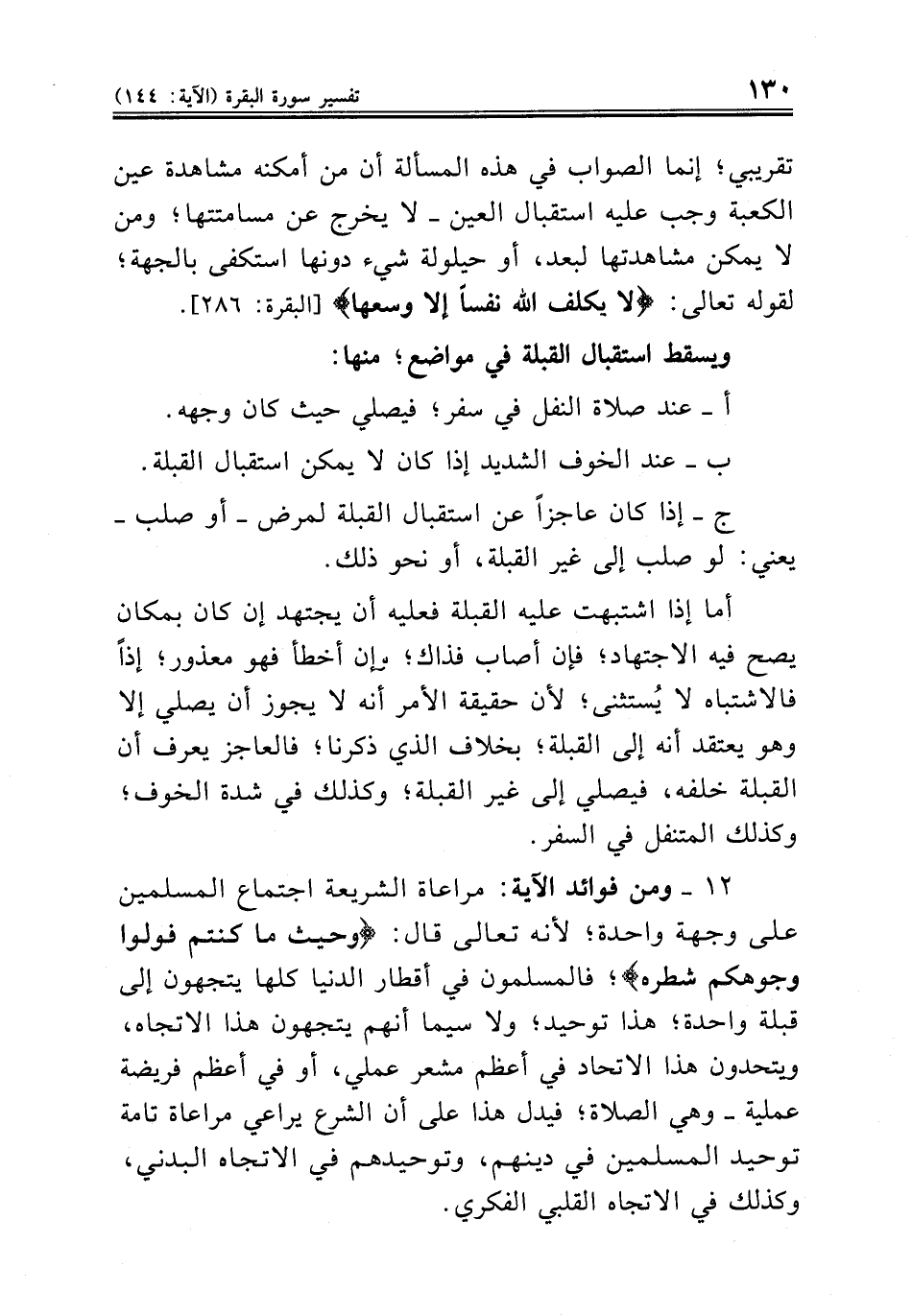١٢ - ومنها مراعاة الشريعة اجتماع المسلمين على وجهة واحدة؛ لأنه تعالى قال: {وحيث ما كنتم فولوا وجوهكم شطره}؛ فالمسلمون في أقطار الدنيا كلها يتجهون إلى قبلة واحدة؛ هذا توحيد؛ ولا سيما أنهم يتجهون هذا الاتجاه، ويتحدون هذا الاتحاد في أعظم مشعر عملي، أو في أعظم فريضة عملية ــ وهي الصلاة؛ فيدل هذا على أن الشرع يراعي مراعاة تامة توحيد المسلمين في دينهم، وتوحيدهم في الاتجاه البدني، وكذلك في الاتجاه القلبي الفكري.