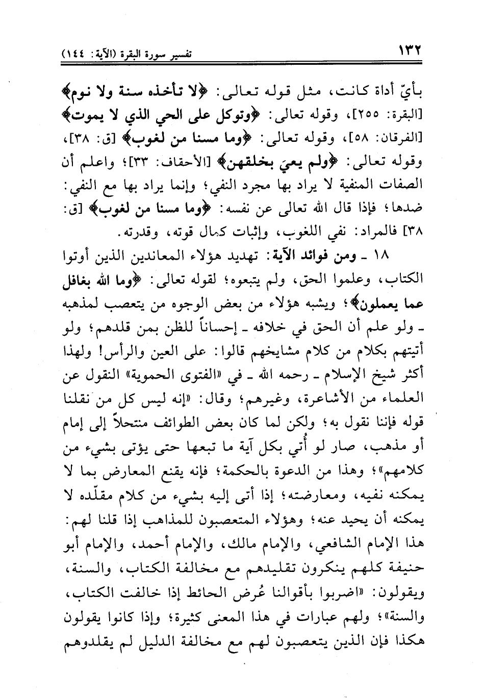١٨ ــ ومن فوائد الآية: تهديد هؤلاء المعاندين الذين أوتوا الكتاب، وعلموا الحق، ولم يتبعوه؛ لقوله تعالى: {وما الله بغافل عما يعملون}؛ ويشبه هؤلاء من بعض الوجوه من يتعصب لمذهبه ــ ولو علم أن الحق في خلافه ــ إحساناً للظن بمن قلدهم؛ ولو أتيتهم بكلام من كلام مشايخهم قالوا: على العين والرأس! ولهذا أكثر شيخ الإسلام ــ رحمه الله ــ في «الفتوى الحموية» النقول عن العلماء من الأشاعرة، وغيرهم؛ وقال: «إنه ليس كل من نقلنا قوله فإننا نقول به؛ ولكن لما كان بعض الطوائف منتحلاً إلى إمام أو مذهب، صار لو أُتي بكل آية ما تبعها حتى يؤتى بشيء من كلامهم" وهذا من الدعوة بالحكمة فإنه يقنع المعارض بما لا يمكنه نفيه ومعارضته إذا أتى إليه بشيء من كلام مقلده لا يمكنه أن يحيد عنه وهؤلاء المتعصبون للمذاهب إذا قلنا لهم هذا الإمام الشافعي والإمام مالك والإمام أحمد والإمام أبوحنيفة كلهم ينكرون تقليدهم مع مخالفة الكتاب، والسنة، ويقولون: «اضربوا بأقوالنا عُرض الحائط إذا خالفت الكتاب، والسنة»؛ ولهم عبارات في هذا المعنى كثيرة؛ وإذا كانوا يقولون هكذا فإن الذين يتعصبون لهم مع مخالفة الدليل لم يقلدوهم