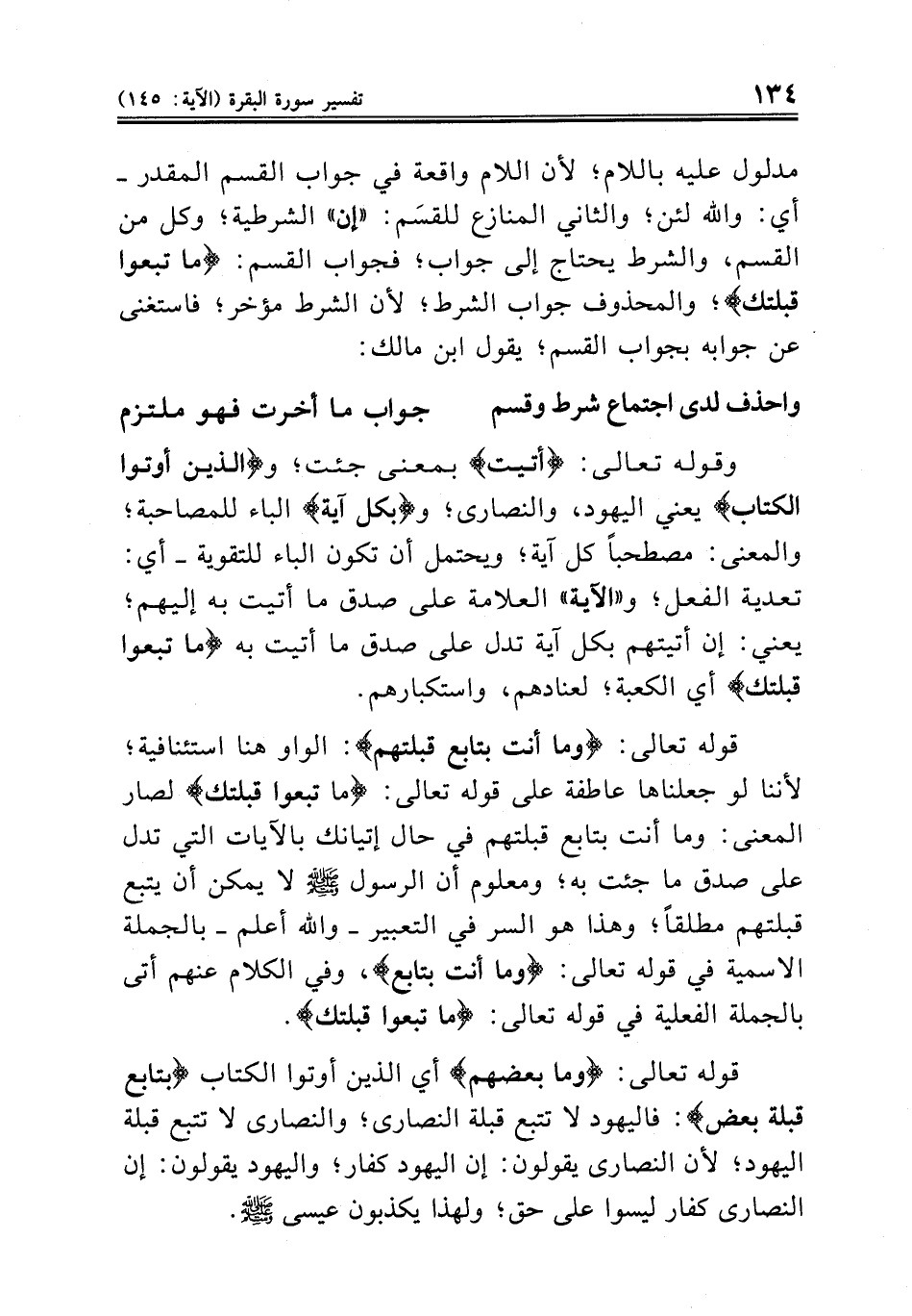 (واحذف لدى اجتماع شرط وقسم جواب ما أخرت فهو ملتزم) وقوله تعالى: {أتيت} بمعنى جئت؛ و {الذين أوتوا الكتاب} يعني اليهود، والنصارى؛ و {بكل آية} الباء للمصاحبة؛ والمعنى: مصطحباً كل آية؛ ويحتمل أن تكون الباء للتقوية ــ أي: تعدية الفعل؛ و «الآية» العلامة على صدق ما أتيت به إليهم؛ يعني: إن أتيتهم بكل آية تدل على صدق ما أتيت به {ما تبعوا قبلتك} أي الكعبة؛ لعنادهم، واستكبارهم.
