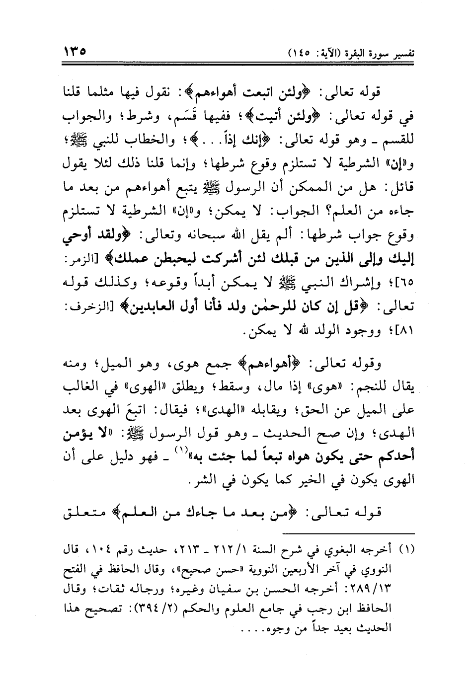 قوله تعالى: {ولئن اتبعت أهواءهم}: نقول فيها مثلما قلنا في قوله تعالى: {ولئن أتيت}؛ ففيها قَسَم، وشرط؛ والجواب للقسم ــ وهو قوله تعالى: {إنك إذاً ... }؛ والخطاب للنبي صلى الله عليه وسلم؛ و «إن» الشرطية لا تستلزم وقوع شرطها؛ وإنما قلنا ذلك لئلا يقول قائل: هل من الممكن أن الرسول صلى الله عليه وسلم يتبع أهواءهم من بعد ما جاءه من العلم؟ الجواب: لا يمكن؛ و «إن» الشرطية لا تستلزم وقوع جواب شرطها: ألم يقل الله سبحانه وتعالى: {ولقد أوحي إليك وإلى الذين من قبلك لئن أشركت ليحبطن عملك} [الزمر: ٦٥]؛ وإشراك النبي صلى الله عليه وسلم لا يمكن أبداً وقوعه؛ وكذلك قوله تعالى: {قل إن كان للرحمن ولد فأنا أول العابدين} [الزخرف: ٨١]؛ ووجود الولد لله لا يمكن.