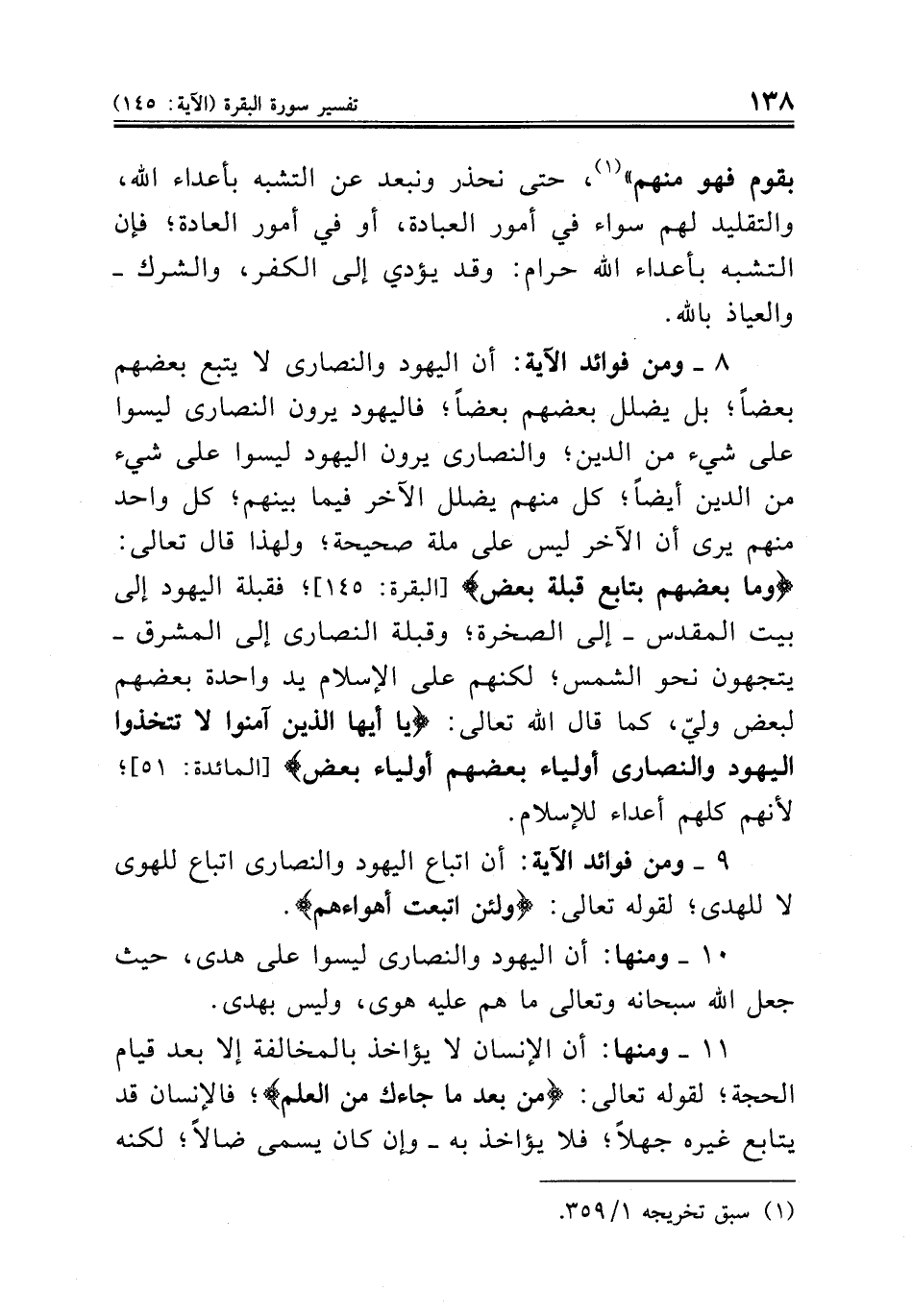 ٨ ــ ومن فوائد الآية: أن اليهود والنصارى لا يتبع بعضهم بعضاً؛ بل يضلل بعضهم بعضاً؛ فاليهود يرون النصارى ليسوا على شيء من الدين؛ والنصارى يرون اليهود ليسوا على شيء من الدين أيضاً؛ كل منهم يضلل الآخر فيما بينهم؛ كل واحد منهم يرى أن الآخر ليس على ملة صحيحة؛ ولهذا قال تعالى: {وما بعضهم بتابع قبلة بعض} [البقرة: ١٤٥]؛ فقبلة اليهود إلى بيت المقدس ــ إلى الصخرة؛ وقبلة النصارى إلى المشرق يتجهون نحو الشمس؛ لكنهم على الإسلام يد واحدة بعضهم لبعض وليّ، كما قال الله تعالى: {يا أيها الذين آمنوا لا تتخذوا اليهود والنصارى أولياء بعضهم أولياء بعض} [المائدة: ٥١]؛ لأنهم كلهم أعداء للإسلام.