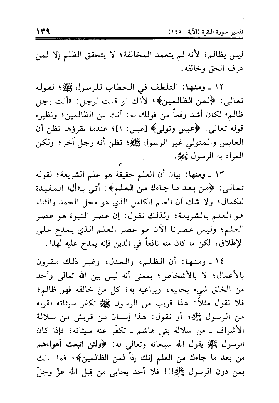 ١٣ ــ ومنها: بيان أن العلم حقيقة هو علم الشريعة؛ لقوله تعالى: {من بعد ما جاءك من العلم}: أتى بـ «أل» المفيدة للكمال؛ ولا شك أن العلم الكامل الذي هو محل الحمد والثناء هو العلم بالشريعة؛ ولذلك نقول: إن عصر النبوة هو عصر العلم؛ وليس عصرنا الآن هو عصر العلم الذي يمدح على الإطلاق؛ لكن ما كان منه نافعاً في الدين فإنه يمدح عليه لهذا.