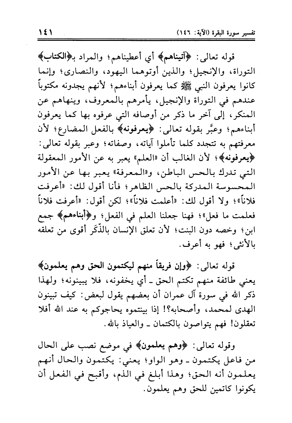 قوله تعالى: {آتيناهم} أي أعطيناهم؛ والمراد بـ {الكتاب} التوراة، والإنجيل؛ والذين أوتوهما اليهود، والنصارى؛ وإنما كانوا يعرفون النبي صلى الله عليه وسلم كما يعرفون أبناءهم؛ لأنهم يجدونه مكتوباً عندهم في التوراة والإنجيل، يأمرهم بالمعروف، وينهاهم عن المنكر، إلى آخر ما ذكر من أوصافه التي عرفوه بها كما يعرفون أبناءهم؛ وعبَّر بقوله تعالى: {يعرفونه} بالفعل المضارع؛ لأن معرفتهم به تتجدد كلما تأملوا آياته، وصفاته؛ وعبر بقوله تعالى: {يعرفونه}؛ لأن الغالب أن «العلم» يعبر به عن الأمور المعقولة التي تدرك بالحس الباطن، و «المعرفة» يعبر بها عن الأمور المحسوسة المدركة بالحس الظاهر؛ فأنا أقول لك: «أعرفت فلاناً»؛ ولا أقول لك: «أعلمت فلاناً»؛ لكن أقول: «أعرفت فلاناً فعلمت ما فعل»؛ فهنا جعلنا العلم في الفعل؛ و {أبناءهم} جمع ابن؛ وخصه دون البنت؛ لأن تعلق الإنسان بالذّكَر أقوى من تعلقه بالأنثى؛ فهو به أعرف.