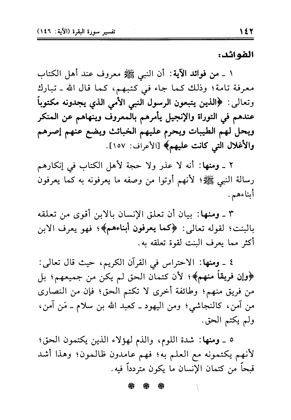 ١ ــ من فوائد الآية: أن النبي صلى الله عليه وسلم معروف عند أهل الكتاب معرفة تامة؛ وذلك كما جاء في كتبهم، كما قال الله ــ تبارك وتعالى: {الذين يتبعون الرسول النبي الأمي الذي يجدونه مكتوباً عندهم في التوراة والإنجيل يأمرهم بالمعروف وينهاهم عن المنكر ويحل لهم الطيبات ويحرم عليهم الخبائث ويضع عنهم إصرهم والأغلال التي كانت عليهم} [الأعراف: ١٥٧].