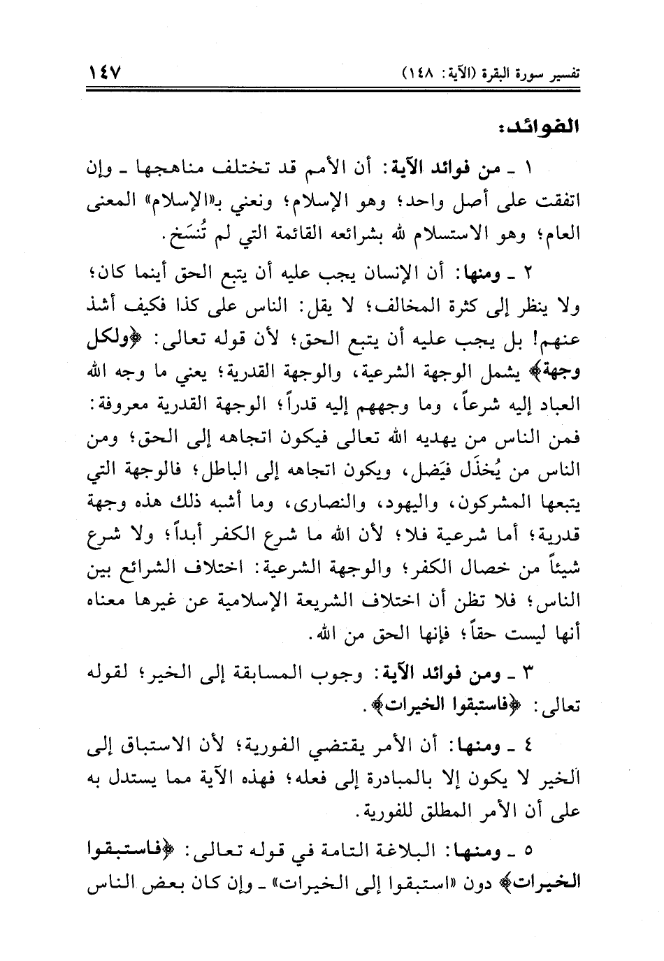 ٢ ــ ومنها: أن الإنسان يجب عليه أن يتبع الحق أينما كان؛ ولا ينظر إلى كثرة المخالف؛ لا يقل: الناس على كذا فكيف أشذ عنهم! بل يجب عليه أن يتبع الحق؛ لأن قوله تعالى: {ولكل وجهة} يشمل الوجهة الشرعية، والوجهة القدرية؛ يعني ما وجه الله العباد إليه شرعاً، وما وجههم إليه قدراً؛ الوجهة القدرية معروفة: فمن الناس من يهديه الله تعالى فيكون اتجاهه إلى الحق؛ ومن الناس من يُخذَل فيَضل، ويكون اتجاهه إلى الباطل؛ فالوجهة التي يتبعها المشركون، واليهود، والنصارى، وما أشبه ذلك هذه وجهة قدرية؛ أما شرعية فلا؛ لأن الله ما شرع الكفر أبداً؛ ولا شرع شيئاً من خصال الكفر؛ والوجهة الشرعية: اختلاف الشرائع بين الناس؛ فلا تظن أن اختلاف الشريعة الإسلامية عن غيرها معناه أنها ليست حقاً؛ فإنها الحق من الله.