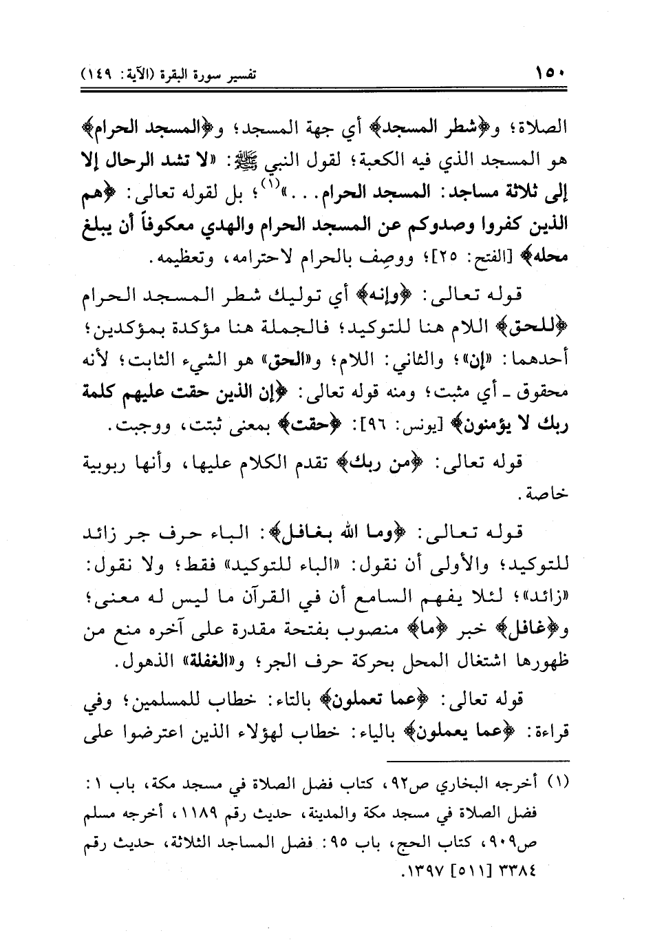 الصلاة؛ و {شطر المسجد} أي جهة المسجد؛ و {المسجد الحرام} هو المسجد الذي فيه الكعبة؛ لقول النبي صلى الله عليه وسلم: «لا تشد الرحال إلا إلى ثلاثة مساجد: المسجد الحرام ... » (¬١)؛ بل لقوله تعالى: {هم الذين كفروا وصدوكم عن المسجد الحرام والهدي معكوفاً أن يبلغ محله} [الفتح: ٢٥]؛ ووصِف بالحرام لاحترامه، وتعظيمه.