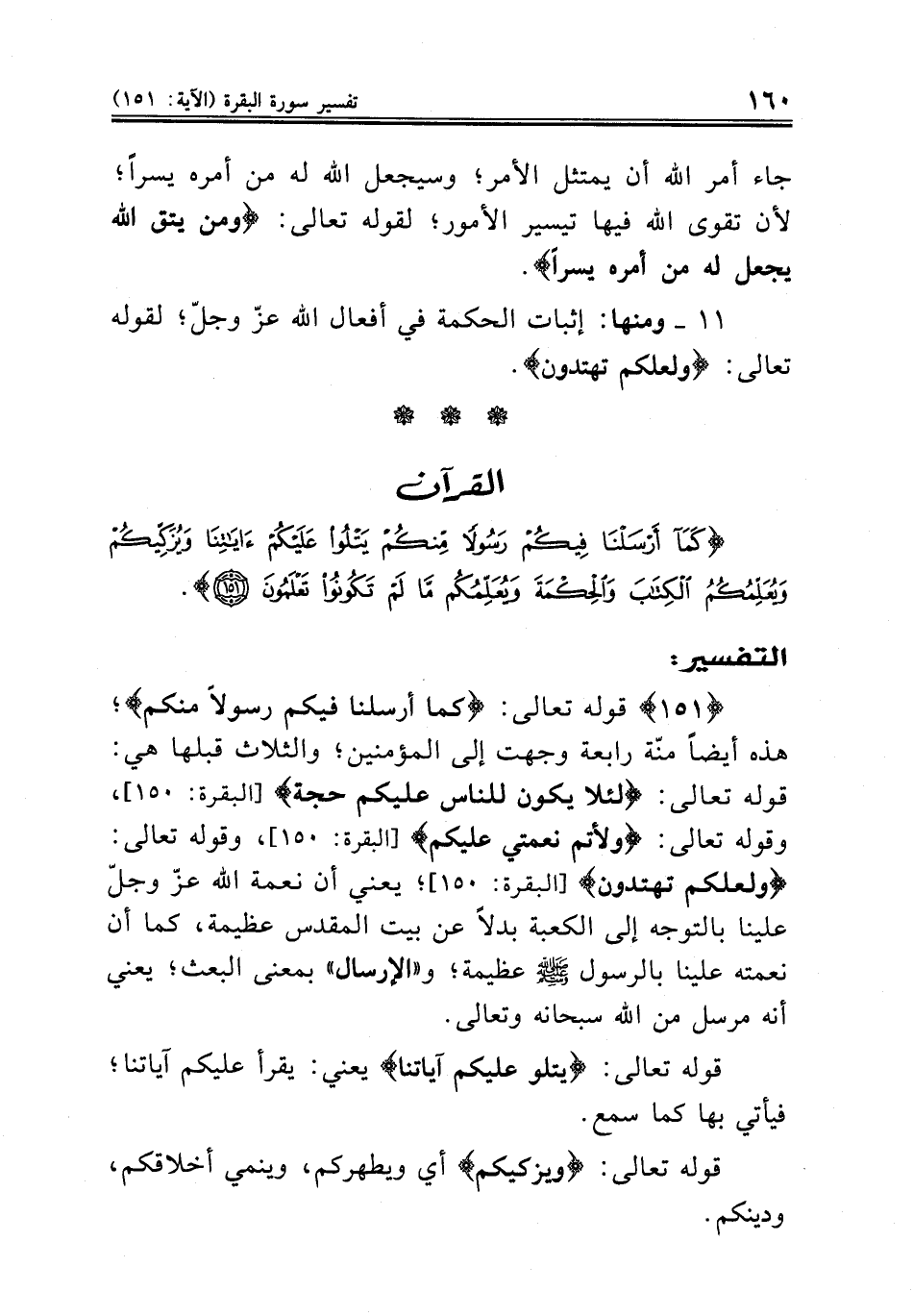 {١٥١} قوله تعالى: {كما أرسلنا فيكم رسولاً منكم}؛ هذه أيضاً منّة رابعة وجهت إلى المؤمنين؛ والثلاث قبلها هي: قوله تعالى: {لئلا يكون للناس عليكم حجة} [البقرة: ١٥٠]، وقوله تعالى: {ولأتم نعمتي عليكم} [البقرة: ١٥٠]، وقوله تعالى: {ولعلكم تهتدون} [البقرة: ١٥٠]؛ يعني أن نعمة الله عزّ وجلّ علينا بالتوجه إلى الكعبة بدلاً عن بيت المقدس عظيمة، كما أن نعمته علينا بالرسول صلى الله عليه وسلم عظيمة؛ و «الإرسال» بمعنى البعث؛ يعني أنه مرسل من الله سبحانه وتعالى.