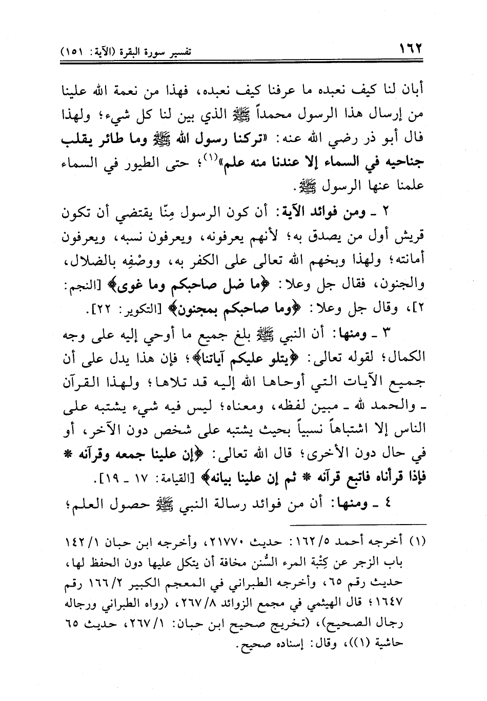 ٣ ــ ومنها: أن النبي صلى الله عليه وسلم بلغ جميع ما أوحي إليه على وجه الكمال؛ لقوله تعالى: {يتلو عليكم آياتنا}؛ فإن هذا يدل على أن جميع الآيات التي أوحاها الله إليه قد تلاها؛ ولهذا القرآن ــ والحمد لله ــ مبين لفظه، ومعناه؛ ليس فيه شيء يشتبه على الناس إلا اشتباهاً نسبياً بحيث يشتبه على شخص دون الآخر، أو في حال دون الأخرى؛ قال الله تعالى: {إن علينا جمعه وقرآنه * فإذا قرأناه فاتبع قرآنه * ثم إن علينا بيانه} [القيامة: ١٧ ــ ١٩].