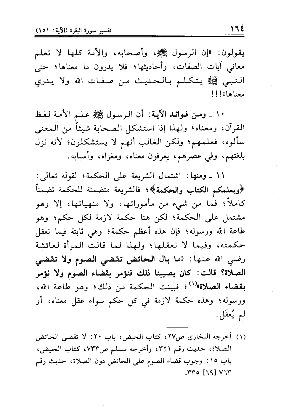 ١١ ــ ومنها: اشتمال الشريعة على الحكمة؛ لقوله تعالى: {ويعلمكم الكتاب والحكمة}؛ فالشريعة متضمنة للحكمة تضمناً كاملاً؛ فما من شيء من مأموراتها، ولا منهياتها، إلا وهو مشتمل على الحكمة؛ لكن هنا حكمة لازمة لكل حكم؛ وهو طاعة الله ورسوله؛ فإن هذه أعظم حكمة؛ وهي ثابتة فيما نعقل حكمته، وفيما لا نعقلها؛ ولهذا لما قالت المرأة لعائشة رضي الله عنها: «ما بال الحائض تقضي الصوم ولا تقضي الصلاة؟ قالت: كان يصيبنا ذلك فنؤمر بقضاء الصوم ولا نؤمر بقضاء الصلاة» (¬١)؛ فبينت الحكمة من ذلك؛ وهو طاعة الله، ورسوله؛ وهذه حكمة لازمة في كل حكم سواء عقل معناه، أو لم يُعقَل.