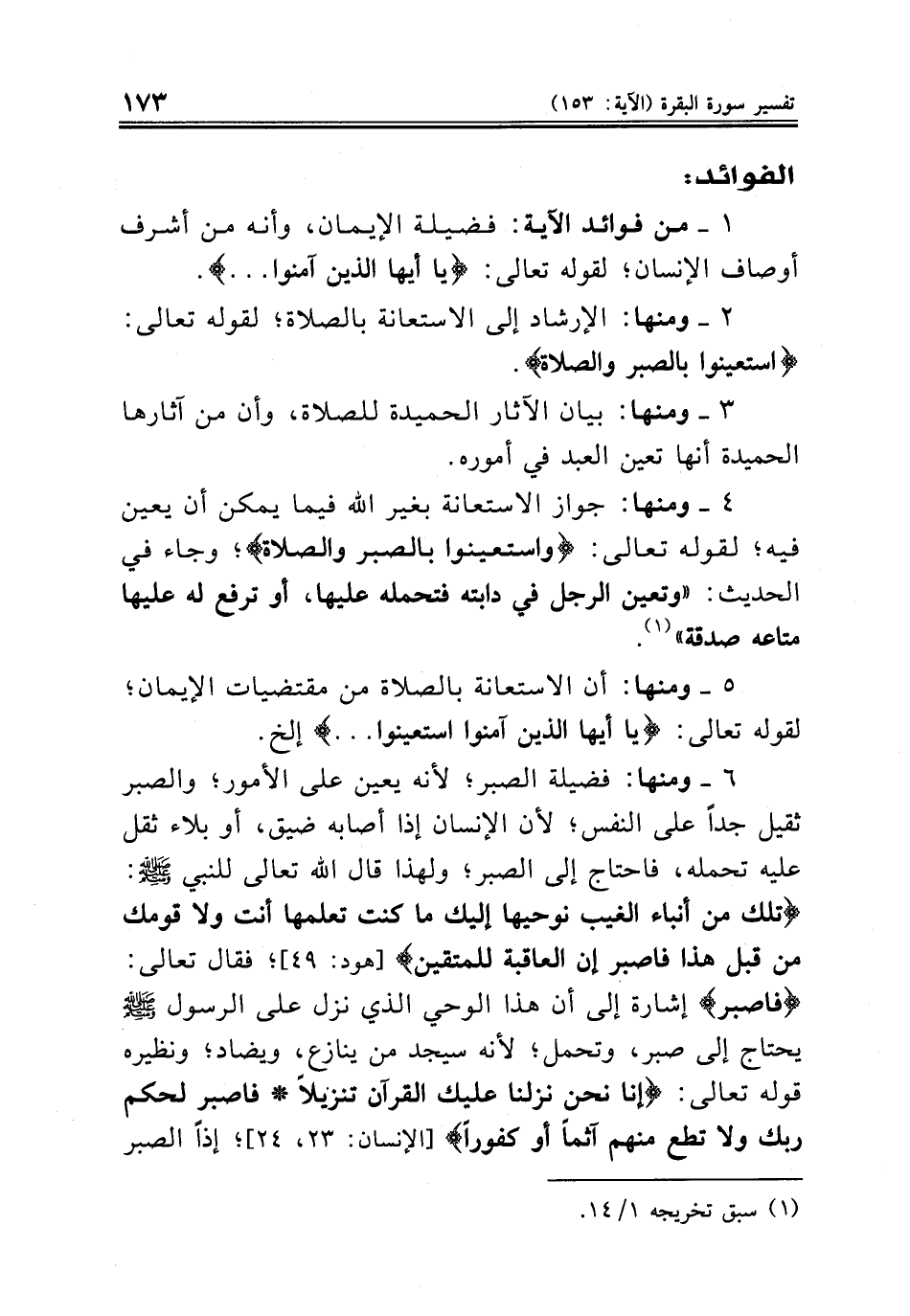 ٤ ــ ومنها: جواز الاستعانة بغير الله فيما يمكن أن يعين فيه؛ لقوله تعالى: {واستعينوا بالصبر والصلاة} وجاء في الحديث: «وتعين الرجل في دابته فتحمله عليها، أو ترفع له عليها متاعه صدقة» (¬١).