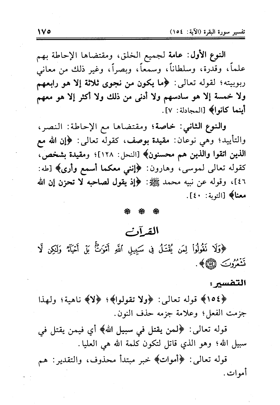 {١٥٤} قوله تعالى: {ولا تقولوا}؛ {لا} ناهية؛ ولهذا جزمت الفعل؛ وعلامة جزمه حذف النون.