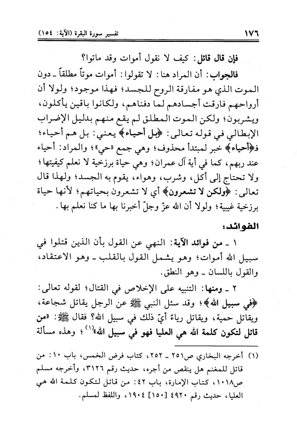 ١ - من فوائد الآية: النهي عن القول بأن الذين قتلوا في سبيل الله أموات؛ وهو يشمل القول بالقلب - وهو الاعتقاد، والقول باللسان - وهو النطق.