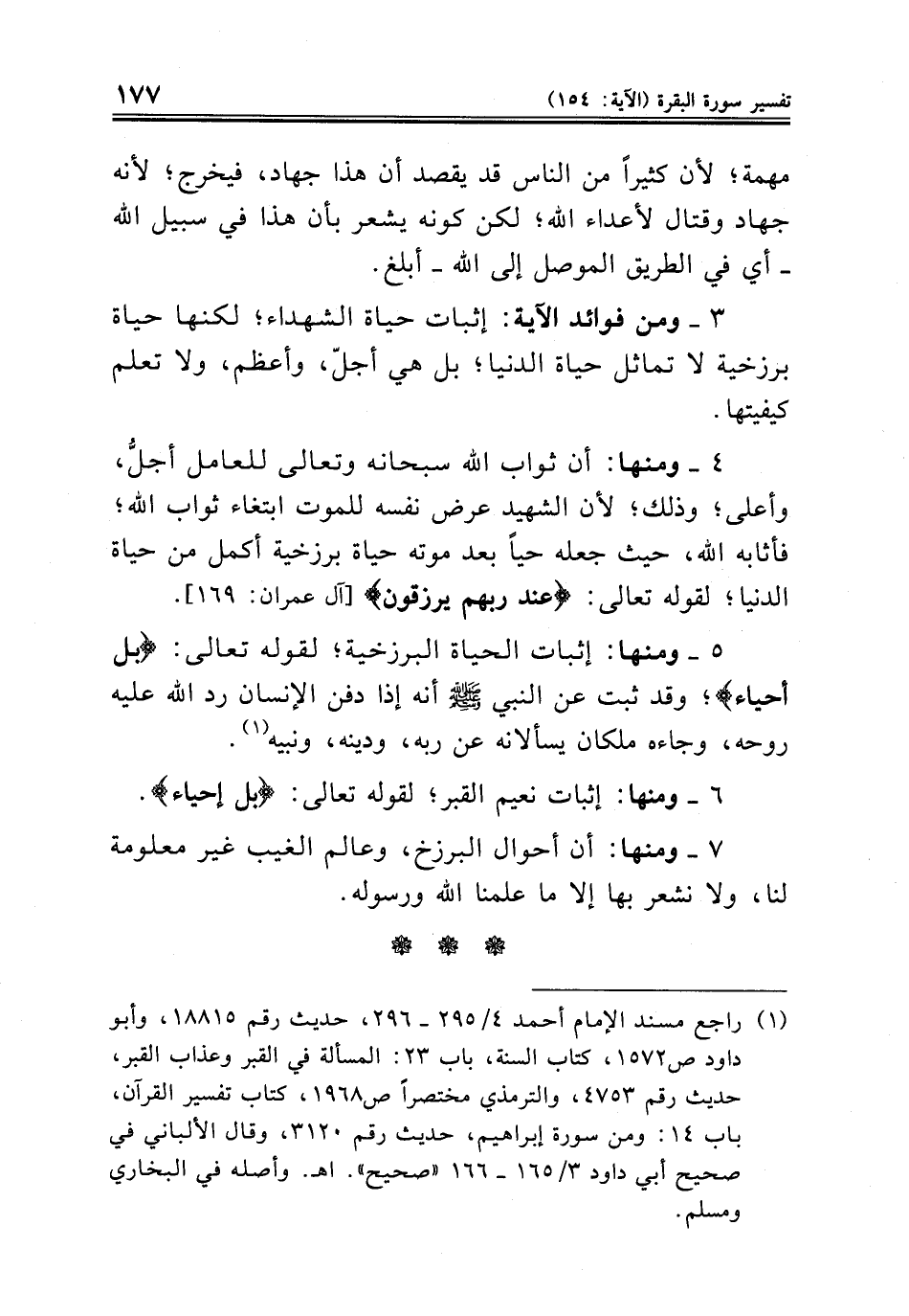 ٥ - ومنها: إثبات الحياة البرزخية؛ لقوله تعالى: {بل أحياء}؛ وقد ثبت عن النبي صلى الله عليه وسلم أنه إذا دفن الإنسان رد الله عليه روحه، وجاءه ملكان يسألانه عن ربه، ودينه، ونبيه (¬١).