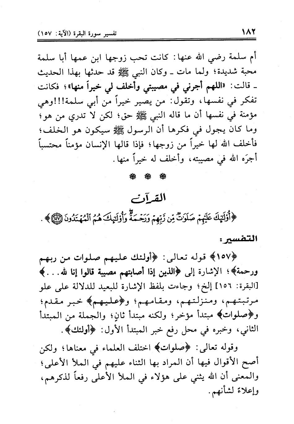 {١٥٧} قوله تعالى: {أولئك عليهم صلوات من ربهم ورحمة}؛ الإشارة إلى {الذين إذا أصابتهم مصيبة قالوا إنا لله ... } [البقرة: ١٥٦] إلخ؛ وجاءت بلفظ الإشارة للبعيد للدلالة على علو مرتبتهم، ومنزلتهم، ومقامهم؛ و {عليهم} خبر مقدم؛ و {صلوات} مبتدأ مؤخر؛ ولكنه مبتدأ ثانٍ؛ والجملة من المبتدأ الثاني، وخبره في محل رفع خبر المبتدأ الأول: {أولئك}.