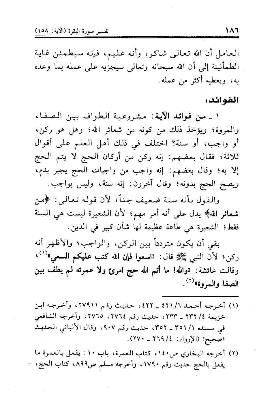 ١ ــ من فوائد الآية: مشروعية الطواف بين الصفا، والمروة؛ ويؤخذ ذلك من كونه من شعائر الله؛ وهل هو ركن، أو واجب، أو سنة؟ اختلف في ذلك أهل العلم على أقوال ثلاثة؛ فقال بعضهم: إنه ركن من أركان الحج لا يتم الحج إلا به؛ وقال بعضهم: إنه واجب من واجبات الحج يجبر بدم، ويصح الحج بدونه؛ وقال آخرون: إنه سنة، وليس بواجب.