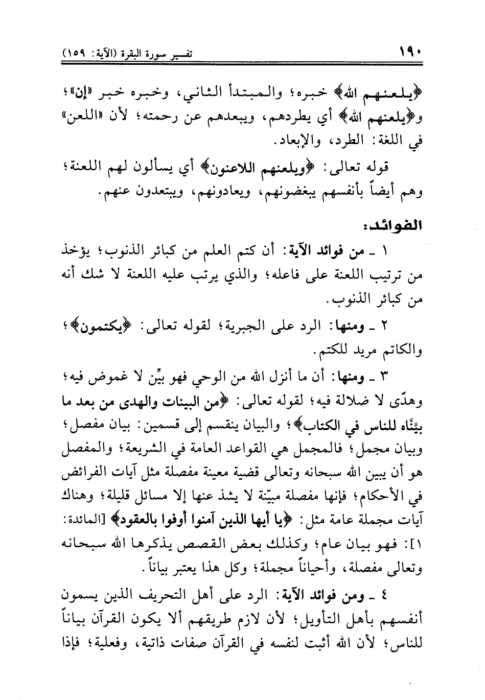 ٣ - ومنها: أن ما أنزل الله من الوحي فهو بيِّن لا غموض فيه؛ وهدًى لا ضلالة فيه؛ لقوله تعالى: {من البينات والهدى من بعد ما بيَّنَّاه للناس في الكتاب}؛ والبيان ينقسم إلى قسمين: بيان مفصل؛ وبيان مجمل؛ فالمجمل هي القواعد العامة في الشريعة؛ والمفصل هو أن يبين الله سبحانه وتعالى قضية معينة مفصلة مثل آيات الفرائض في الأحكام؛ فإنها مفصلة مبيّنة لا يشذ عنها إلا مسائل قليلة؛ وهناك آيات مجملة عامة مثل: {يا أيها الذين آمنوا أوفوا بالعقود} [المائدة: ١]: فهو بيان عام؛ وكذلك بعض القصص يذكرها الله سبحانه وتعالى مفصلة، وأحياناً مجملة؛ وكل هذا يعتبر بياناً.