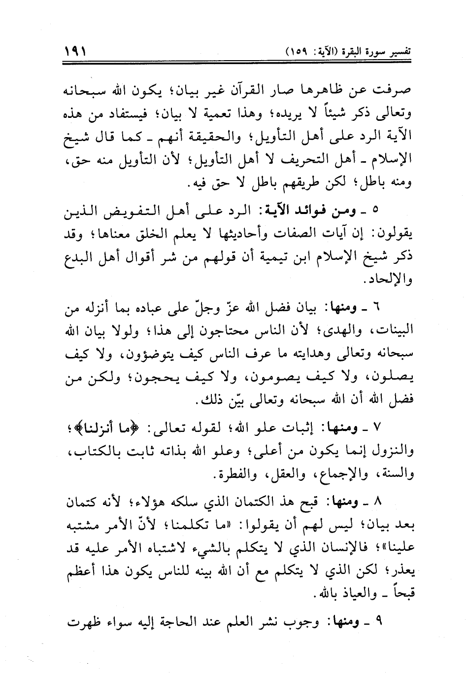 ٦ ــ ومنها: بيان فضل الله عزّ وجلّ على عباده بما أنزله من البينات، والهدى؛ لأن الناس محتاجون إلى هذا؛ ولولا بيان الله سبحانه وتعالى وهدايته ما عرف الناس كيف يتوضؤون، ولا كيف يصلون، ولا كيف يصومون، ولا كيف يحجون؛ ولكن من فضل الله أن الله سبحانه وتعالى بيّن ذلك.