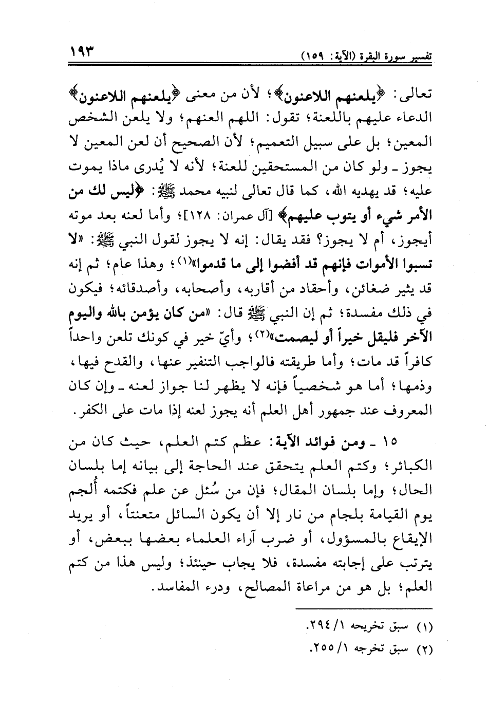 ١٥ ــ ومن فوائد الآية: عظم كتم العلم، حيث كان من الكبائر؛ وكتم العلم يتحقق عند الحاجة إلى بيانه إما بلسان الحال؛ وإما بلسان المقال؛ فإن من سُئل عن علم فكتمه أُلجم يوم القيامة بلجام من نار إلا أن يكون السائل متعنتاً، أو يريد الإيقاع بالمسؤول، أو ضرب آراء العلماء بعضها ببعض، أو يترتب على إجابته مفسدة، فلا يجاب حينئذ؛ وليس هذا من كتم العلم؛ بل هو من مراعاة المصالح، ودرء المفاسد.