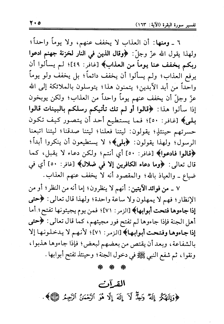 ٦ ــ ومنها: أن العذاب لا يخفف عنهم، ولا يوماً واحداً؛ ولهذا يقول الله عزّ وجلّ: {وقال الذين في النار لخزنة جهنم ادعوا ربكم يخفف عنا يوماً من العذاب} [غافر: ٤٩]؛ لم يسألوا أن يرفع العذاب؛ ولم يسألوا أن يخفف دائماً؛ بل يخفف ولو يوماً واحداً من أبد الآبدين؛ يتمنون هذا؛ يتوسلون بالملائكة إلى الله عزّ وجلّ أن يخفف عنهم يوماً واحداً من العذاب؛ ولكن يوبخون إذا سألوا هذا: {قالوا أو لم تك تأتيكم رسلكم بالبينات قالوا بلى} [غافر: ٥٠]؛ فما يستطيع أحد أن يتصور كيف تكون حسرتهم حينئذٍ؛ يقولون: ليتنا فعلنا؛ ليتنا صدقنا؛ ليتنا اتبعنا الرسول؛ ولهذا يقولون: {بلى}؛ لا يستطيعون أن ينكروا أبداً؛ {قالوا فادعوا} [غافر: ٥٠] أي أنتم؛ ولكن دعاء لا يقبل، كما قال تعالى: {وما دعاء الكافرين إلا في ضلال} [غافر: ٥٠] أي في ضياع ــ والعياذ بالله؛ والمقصود أنه لا يخفف عنهم العذاب.