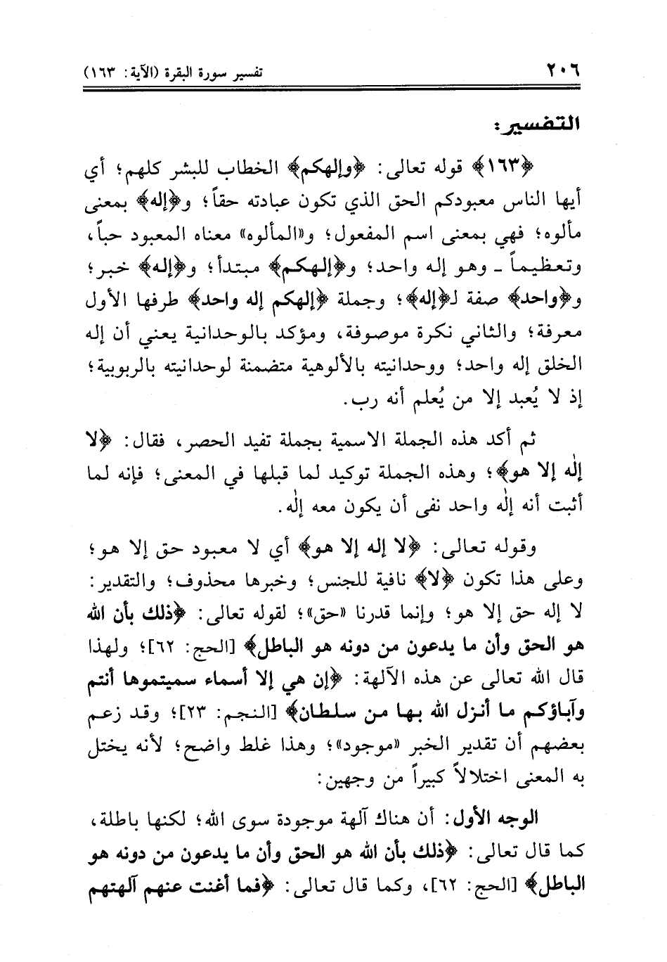 {١٦٣} قوله تعالى: {وإلهكم} الخطاب للبشر كلهم؛ أي أيها الناس معبودكم الحق الذي تكون عبادته حقاً؛ و {إله} بمعنى مألوه؛ فهي بمعنى اسم المفعول؛ و «المألوه» معناه المعبود حباً، وتعظيماً ــ وهو إله واحد؛ و {إلهكم} مبتدأ؛ و {إله} خبر؛ و {واحد} صفة لـ {إله}؛ وجملة {إلهكم إله واحد} طرفها الأول معرفة؛ والثاني نكرة موصوفة، ومؤكد بالوحدانية يعني أن إله الخلق إله واحد؛ ووحدانيته بالألوهية متضمنة لوحدانيته بالربوبية؛ إذ لا يُعبد إلا من يُعلم أنه رب.