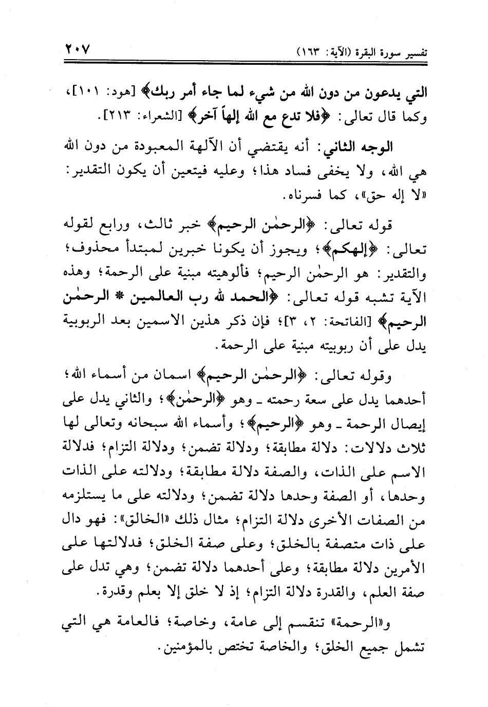 قوله تعالى: {الرحمن الرحيم} خبر ثالث، ورابع لقوله تعالى: {إلهكم}؛ ويجوز أن يكونا خبرين لمبتدأ محذوف؛ والتقدير: هو الرحمن الرحيم؛ فألوهيته مبنية على الرحمة؛ وهذه الآية تشبه قوله تعالى: {الحمد لله رب العالمين * الرحمن الرحيم} [الفاتحة: ٢، ٣]؛ فإن ذكر هذين الاسمين بعد الربوبية يدل على أن ربوبيته مبنية على الرحمة.