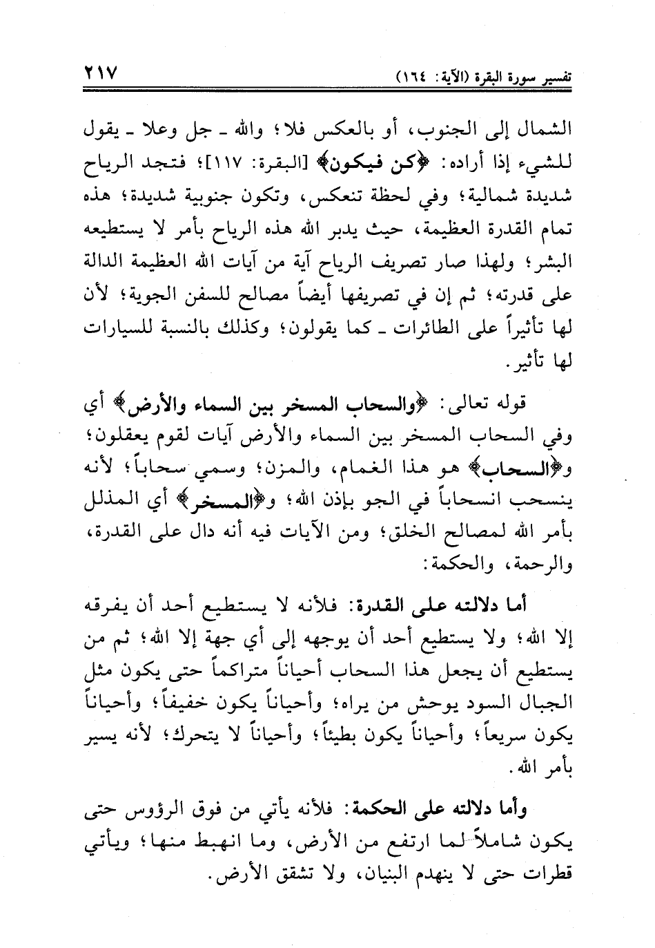 الشمال إلى الجنوب، أو بالعكس فلا؛ والله - جل وعلا - يقول للشيء إذا أراده: {كن فيكون} [البقرة: ١١٧]؛ فتجد الرياح شديدة شمالية؛ وفي لحظة تنعكس، وتكون جنوبية شديدة؛ هذه تمام القدرة العظيمة، حيث يدبر الله هذه الرياح بأمر لا يستطيعه البشر؛ ولهذا صار تصريف الرياح آية من آيات الله العظيمة الدالة على قدرته؛ ثم إن في تصريفها أيضاً مصالح للسفن الجوية؛ لأن لها تأثيراً على الطائرات - كما يقولون؛ وكذلك بالنسبة للسيارات لها تأثير.