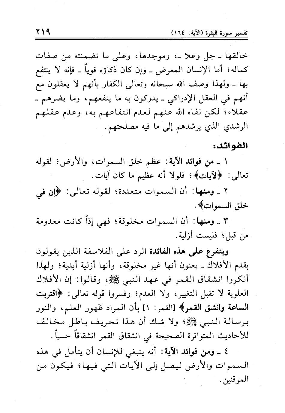ويتفرع على هذه الفائدة الرد على الفلاسفة الذين يقولون بقدم الأفلاك ــ يعنون أنها غير مخلوقة، وأنها أزلية أبدية؛ ولهذا أنكروا انشقاق القمر في عهد النبي صلى الله عليه وسلم، وقالوا: إن الأفلاك العلوية لا تقبل التغيير، ولا العدم؛ وفسروا قوله تعالى: {اقتربت الساعة وانشق القمر} [القمر: ١] بأن المراد ظهور العلم، والنور برسالة النبي صلى الله عليه وسلم؛ ولا شك أن هذا تحريف باطل مخالف للأحاديث المتواترة الصحيحة في انشقاق القمر انشقاقاً حسياً.