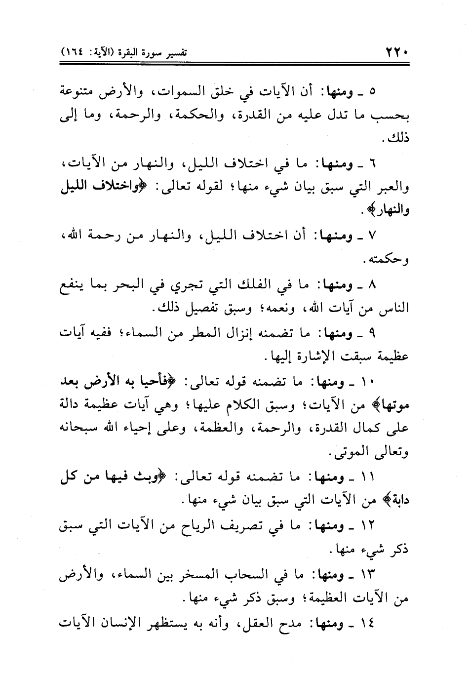١٠ ــ ومنها: ما تضمنه قوله تعالى: {فأحيا به الأرض بعد موتها} من الآيات؛ وسبق الكلام عليها؛ وهي آيات عظيمة دالة على كمال القدرة، والرحمة، والعظمة، وعلى إحياء الله سبحانه وتعالى الموتى.