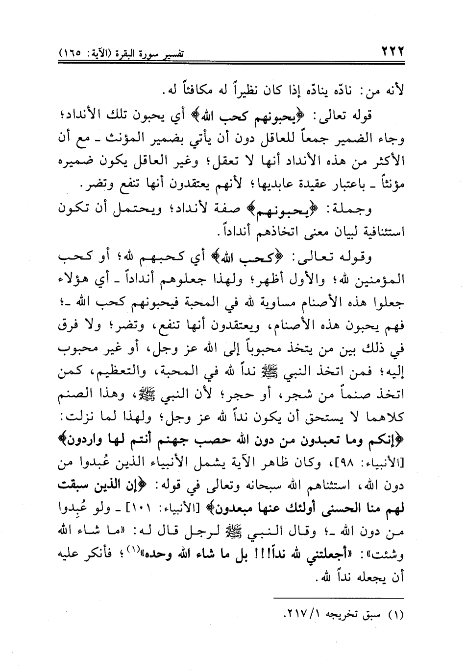 وقوله تعالى: {كحب الله} أي كحبهم لله؛ أو كحب المؤمنين لله؛ والأول أظهر؛ ولهذا جعلوهم أنداداً - أي هؤلاء جعلوا هذه الأصنام مساوية لله في المحبة فيحبونهم كحب الله -؛ فهم يحبون هذه الأصنام، ويعتقدون أنها تنفع، وتضر؛ ولا فرق في ذلك بين من يتخذ محبوباً إلى الله عز وجل، أو غير محبوب إليه؛ فمن اتخذ النبي صلى الله عليه وسلم نداً لله في المحبة، والتعظيم، كمن اتخذ صنماً من شجر، أو حجر؛ لأن النبي صلى الله عليه وسلم، وهذا الصنم كلاهما لا يستحق أن يكون نداً لله عز وجل؛ ولهذا لما نزلت: {إنكم وما تعبدون من دون الله حصب جهنم أنتم لها واردون} [الأنبياء: ٩٨]، وكان ظاهر الآية يشمل الأنبياء الذين عُبدوا من دون الله، استثناهم الله سبحانه وتعالى في قوله: {إن الذين سبقت لهم منا الحسنى أولئك عنها مبعدون} [الأنبياء: ١٠١]- ولو عُبِدوا من دون الله -؛ وقال النبي صلى الله عليه وسلم لرجل قال له: «ما شاء الله وشئت»: «أجعلتني لله نداً!!! بل ما شاء الله وحده» (¬١)؛ فأنكر عليه أن يجعله نداً لله.