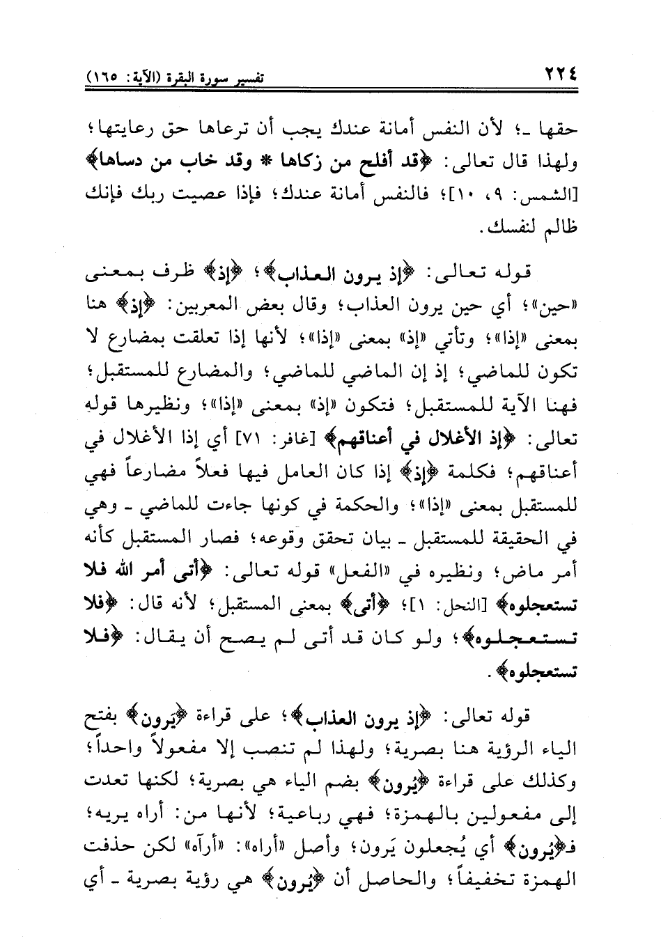 قوله تعالى: {إذ يرون العذاب}؛ {إذ} ظرف بمعنى «حين»؛ أي حين يرون العذاب؛ وقال بعض المعربين: {إذ} هنا بمعنى «إذا»؛ وتأتي «إذ» بمعنى «إذا»؛ لأنها إذا تعلقت بمضارع لا تكون للماضي؛ إذ إن الماضي للماضي؛ والمضارع للمستقبل؛ فهنا الآية للمستقبل؛ فتكون «إذ» بمعنى «إذا»؛ ونظيرها قوله تعالى: {إذ الأغلال في أعناقهم} [غافر: ٧١] أي إذا الأغلال في أعناقهم؛ فكلمة {إذ} إذا كان العامل فيها فعلاً مضارعاً فهي للمستقبل بمعنى «إذا»؛ والحكمة في كونها جاءت للماضي - وهي في الحقيقة للمستقبل - بيان تحقق وقوعه؛ فصار المستقبل كأنه أمر ماض؛ ونظيره في «الفعل» قوله تعالى: {أتى أمر الله فلا تستعجلوه} [النحل: ١]؛ {أتى} بمعنى المستقبل؛ لأنه قال: {فلا تستعجلوه}؛ ولو كان قد أتى لم يصح أن يقال: {فلا تستعجلوه}.