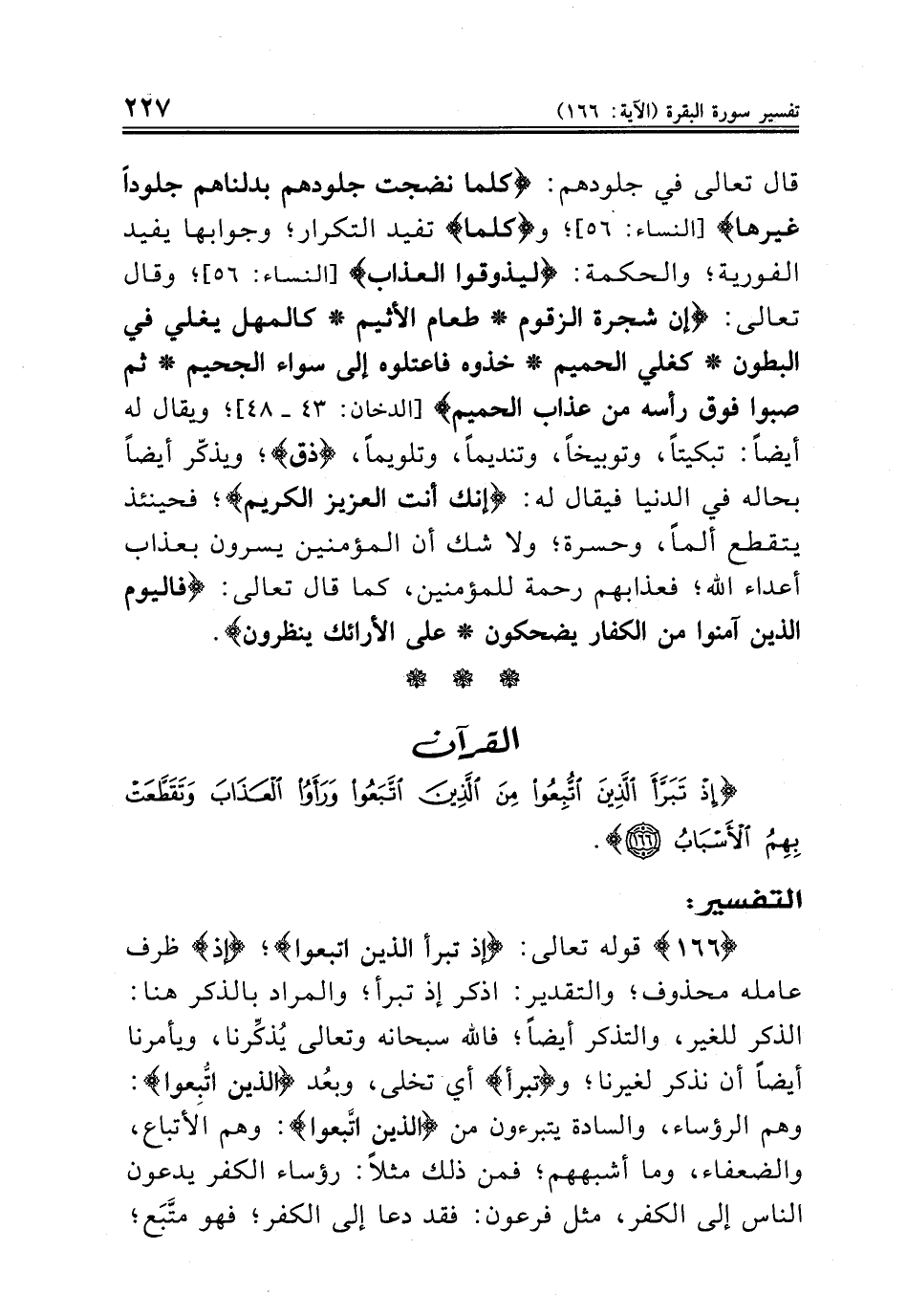 {١٦٦} قوله تعالى: {إذ تبرأ الذين اتبعوا}؛ {إذ} ظرف عامله محذوف؛ والتقدير: اذكر إذ تبرأ؛ والمراد بالذكر هنا: الذكر للغير، والتذكر أيضاً؛ فالله سبحانه وتعالى يُذكِّرنا، ويأمرنا أيضاً أن نذكر لغيرنا؛ و {تبرأ} أي تخلى، وبعُد {الذين اتُّبِعوا}: وهم الرؤساء، والسادة يتبرءون من {الذين اتَّبعوا}: وهم الأتباع، والضعفاء، وما أشبههم؛ فمن ذلك مثلاً: رؤساء الكفر يدعون الناس إلى الكفر، مثل فرعون: فقد دعا إلى الكفر؛ فهو متَّبَع؛