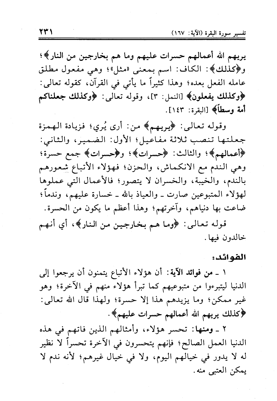 وقوله تعالى: {يريهم} من: أرى يُري؛ فزيادة الهمزة جعلتها تنصب ثلاثة مفاعيل؛ الأول: الضمير، والثاني: {أعمالهم}؛ والثالث: {حسرات}؛ و {حسرات} جمع حسرة؛ وهي الندم مع الانكماش، والحزن؛ فهؤلاء الأتباع شعورهم بالندم، والخيبة، والخسران لا يتصور؛ فالأعمال التي عملوها لهؤلاء المتبوعين صارت - والعياذ بالله - خسارة عليهم، وندماً؛ ضاعت بها دنياهم، وآخرتهم؛ وهذا أعظم ما يكون من الحسرة.