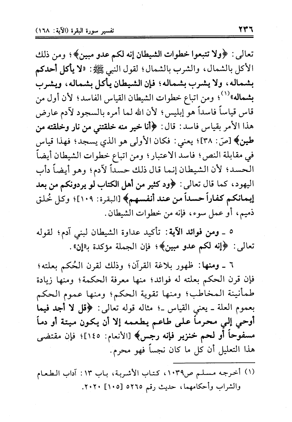 تعالى: {ولا تتبعوا خطوات الشيطان إنه لكم عدو مبين}؛ ومن ذلك الأكل بالشمال، والشرب بالشمال؛ لقول النبي صلى الله عليه وسلم: «لا يأكل أحدكم بشماله، ولا يشرب بشماله؛ فإن الشيطان يأكل بشماله، ويشرب بشماله» (¬١)؛ ومن اتباع خطوات الشيطان القياس الفاسد؛ لأن أول من قاس قياساً فاسداً هو إبليس؛ لأن الله لما أمره بالسجود لآدم عارض هذا الأمر بقياس فاسد: قال: {أنا خير منه خلقتني من نار وخلقته من طين} [ص~: ٣٨]؛ يعني: فكان الأولى هو الذي يسجد؛ فهذا قياس في مقابلة النص؛ فاسد الاعتبار؛ ومن اتباع خطوات الشيطان أيضاً الحسد؛ لأن الشيطان إنما قال ذلك حسداً لآدم؛ وهو أيضاً دأب اليهود، كما قال تعالى: {ود كثير من أهل الكتاب لو يردونكم من بعد إيمانكم كفاراً حسداً من عند أنفسهم} [البقرة: ١٠٩]؛ وكل خُلق ذميم، أو عمل سوء، فإنه من خطوات الشيطان.