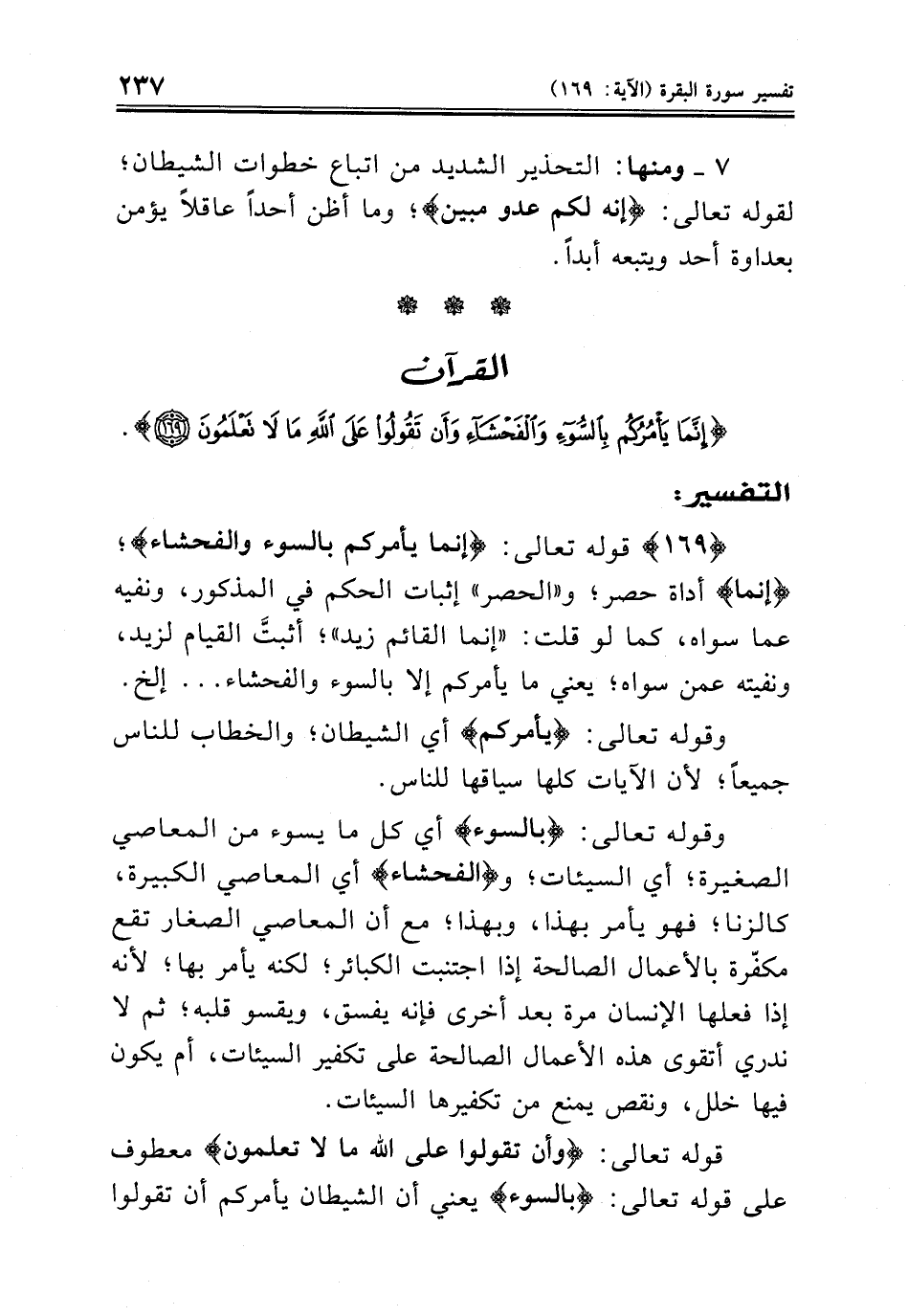 {١٦٩} قوله تعالى: {إنما يأمركم بالسوء والفحشاء}؛ {إنما} أداة حصر؛ و «الحصر» إثبات الحكم في المذكور، ونفيه عما سواه، كما لو قلت: «إنما القائم زيد»؛ أثبتَّ القيام لزيد، ونفيته عمن سواه؛ يعني ما يأمركم إلا بالسوء والفحشاء ... إلخ.