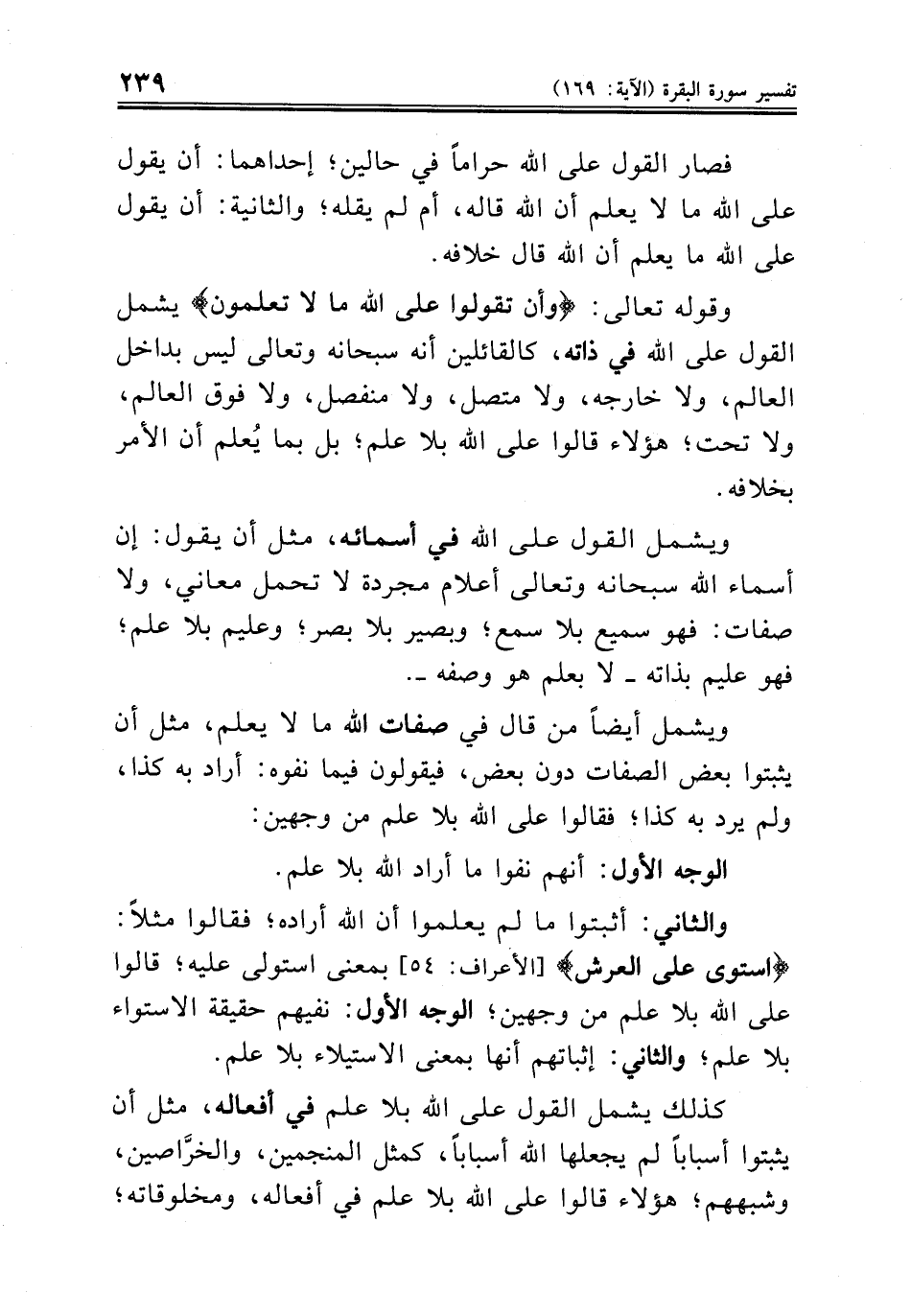 والثاني: أثبتوا ما لم يعلموا أن الله أراده؛ فقالوا مثلاً: {استوى على العرش} [الأعراف: ٥٤] بمعنى استولى عليه؛ قالوا على الله بلا علم من وجهين؛ الوجه الأول: نفيهم حقيقة الاستواء بلا علم؛ والثاني: إثباتهم أنها بمعنى الاستيلاء بلا علم.