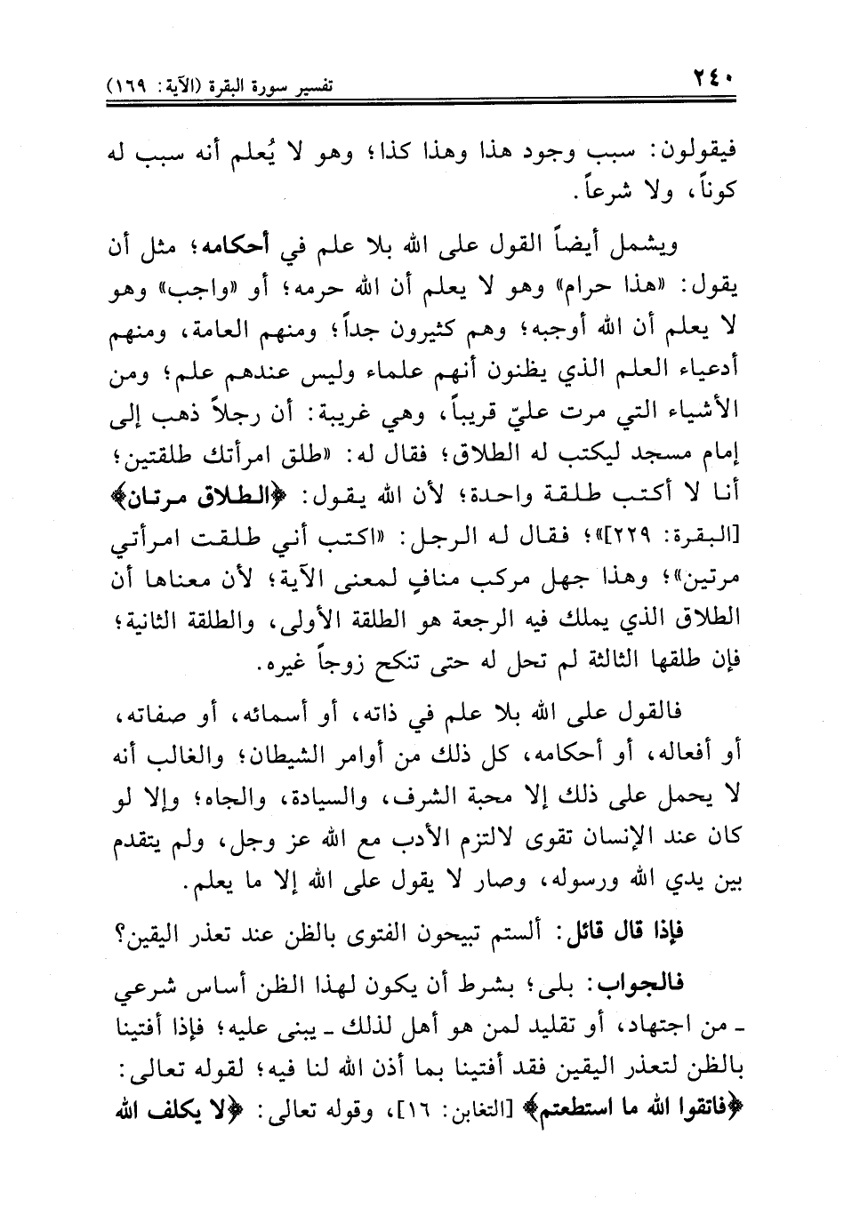 ويشمل أيضاً القول على الله بلا علم في أحكامه؛ مثل أن يقول: «هذا حرام» وهو لا يعلم أن الله حرمه؛ أو «واجب» وهو لا يعلم أن الله أوجبه؛ وهم كثيرون جداً؛ ومنهم العامة، ومنهم أدعياء العلم الذي يظنون أنهم علماء وليس عندهم علم؛ ومن الأشياء التي مرت عليّ قريباً، وهي غريبة: أن رجلاً ذهب إلى إمام مسجد ليكتب له الطلاق؛ فقال له: «طلق امرأتك طلقتين؛ أنا لا أكتب طلقة واحدة؛ لأن الله يقول: {الطلاق مرتان} [البقرة: ٢٢٩]»؛ فقال له الرجل: «اكتب أني طلقت امرأتي مرتين»؛ وهذا جهل مركب منافٍ لمعنى الآية؛ لأن معناها أن الطلاق الذي يملك فيه الرجعة هو الطلقة الأولى، والطلقة الثانية؛ فإن طلقها الثالثة لم تحل له حتى تنكح زوجاً غيره.