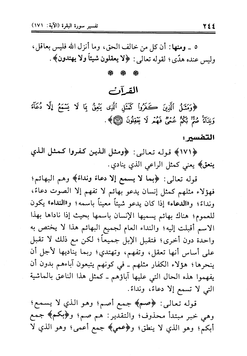 ( وَمَثَلُ الَّذِينَ كَفَرُوا كَمَثَلِ الَّذِي يَنْعِقُ بِمَا لا يَسْمَعُ إِلَاّ دُعَاءً وَنِدَاءً صُمٌّ بُكْمٌ عُمْيٌ فَهُمْ لا يَعْقِلُونَ) (البقرة: ١٧١)