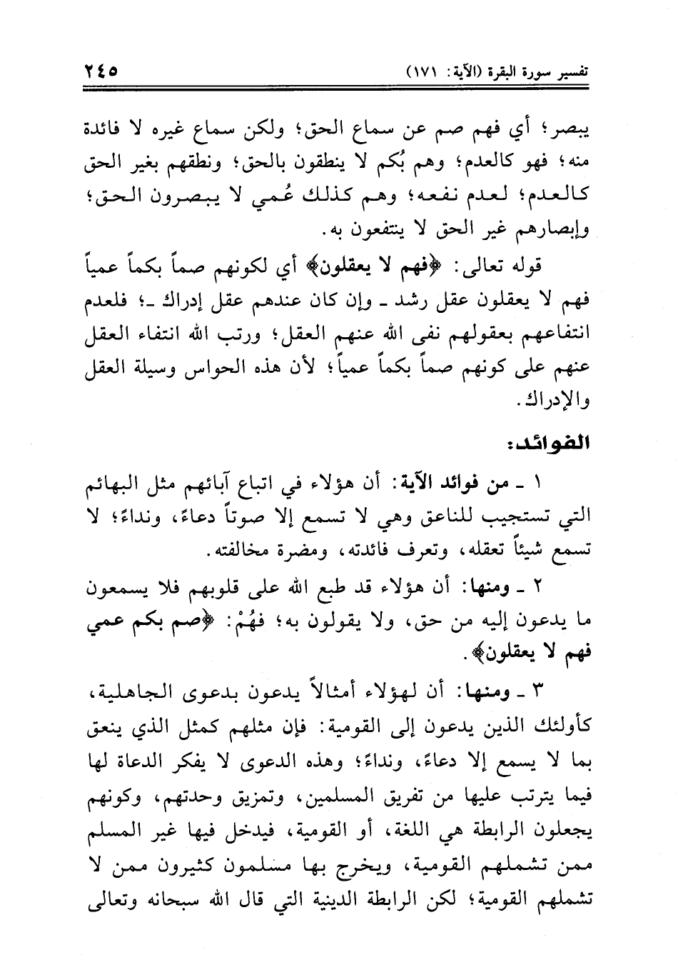 ١ ــ من فوائد الآية: أن هؤلاء في اتباع آبائهم مثل البهائم التي تستجيب للناعق وهي لا تسمع إلا صوتاً دعاءً، ونداءً؛ لا تسمع شيئاً تعقله، وتعرف فائدته، ومضرة مخالفته.