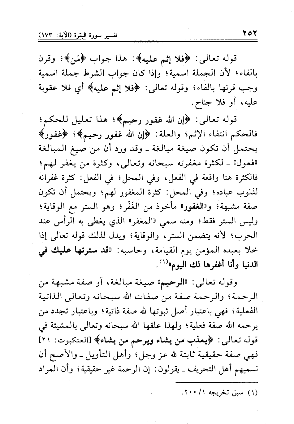 قوله تعالى: {إن الله غفور رحيم}؛ هذا تعليل للحكم؛ فالحكم انتفاء الإثم؛ والعلة: {إن الله غفور رحيم}؛ {غفور} يحتمل أن تكون صيغة مبالغة - وقد ورد أن من صيغ المبالغة «فعول» - لكثرة مغفرته سبحانه وتعالى، وكثرة من يغفر لهم؛ فالكثرة هنا واقعة في الفعل، وفي المحل؛ في الفعل: كثرة غفرانه لذنوب عباده؛ وفي المحل: كثرة المغفور لهم؛ ويحتمل أن تكون صفة مشبهة؛ و «الغفور» مأخوذ من الغَفْر؛ وهو الستر مع الوقاية؛ وليس الستر فقط؛ ومنه سمي «المغفر» الذي يغطى به الرأس عند الحرب؛ لأنه يتضمن الستر، والوقاية؛ ويدل لذلك قوله تعالى إذا خلا بعبده المؤمن يوم القيامة، وحاسبه: «قد سترتها عليك في الدنيا وأنا أغفرها لك اليوم» (¬١).