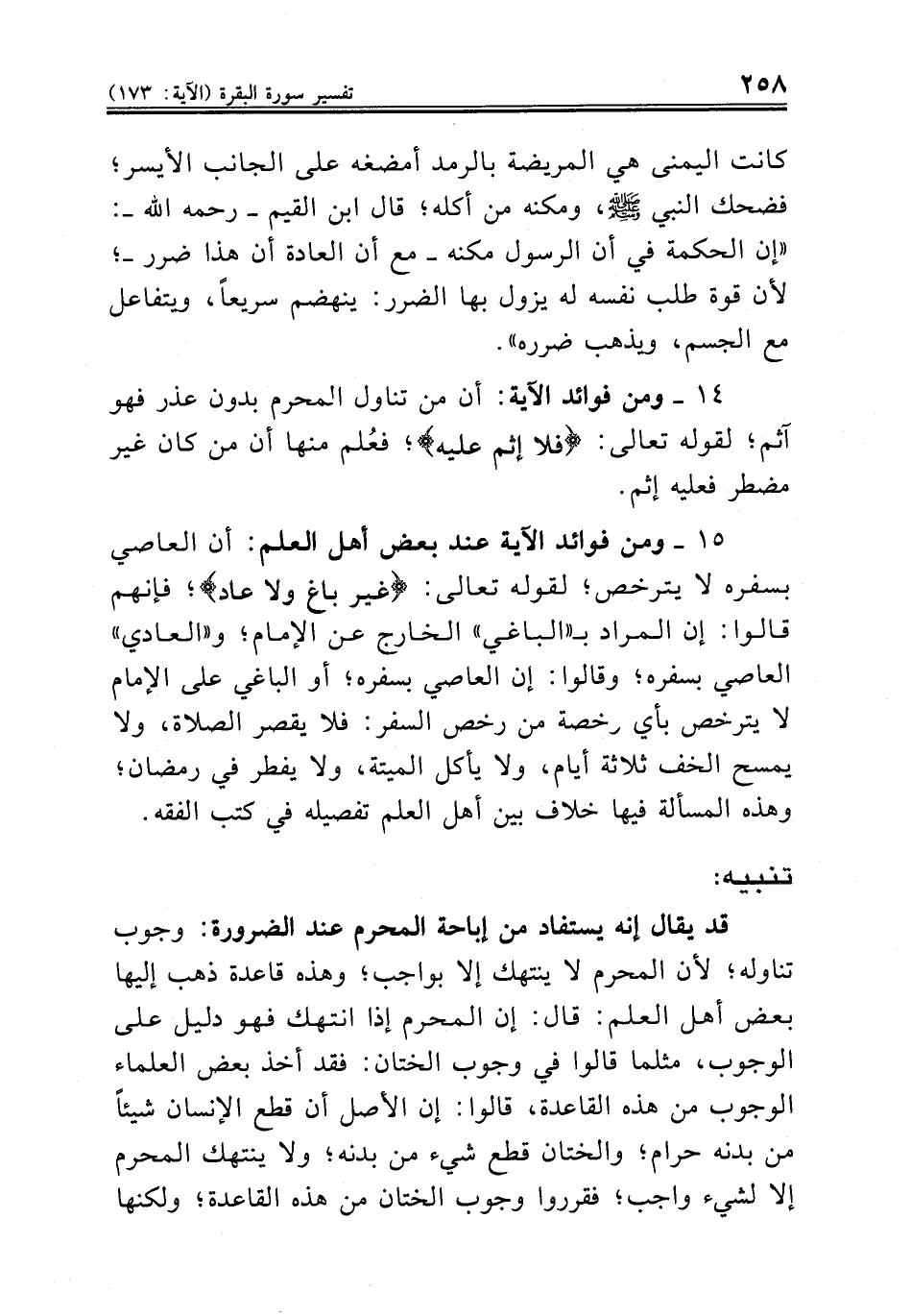 ١٥ ــ ومن فوائد الآية عند بعض أهل العلم: أن العاصي بسفره لا يترخص؛ لقوله تعالى: {غير باغ ولا عاد فإنهم قالوا: إن المراد بـ «الباغي» الخارج عن الإمام؛ و «العادي» العاصي بسفره؛ وقالوا: إن العاصي بسفره؛ أو الباغي على الإمام لا يترخص بأي رخصة من رخص السفر: فلا يقصر الصلاة، ولا يمسح الخف ثلاثة أيام، ولا يأكل الميتة، ولا يفطر في رمضان؛ وهذه المسألة فيها خلاف بين أهل العلم تفصيله في كتب الفقه.