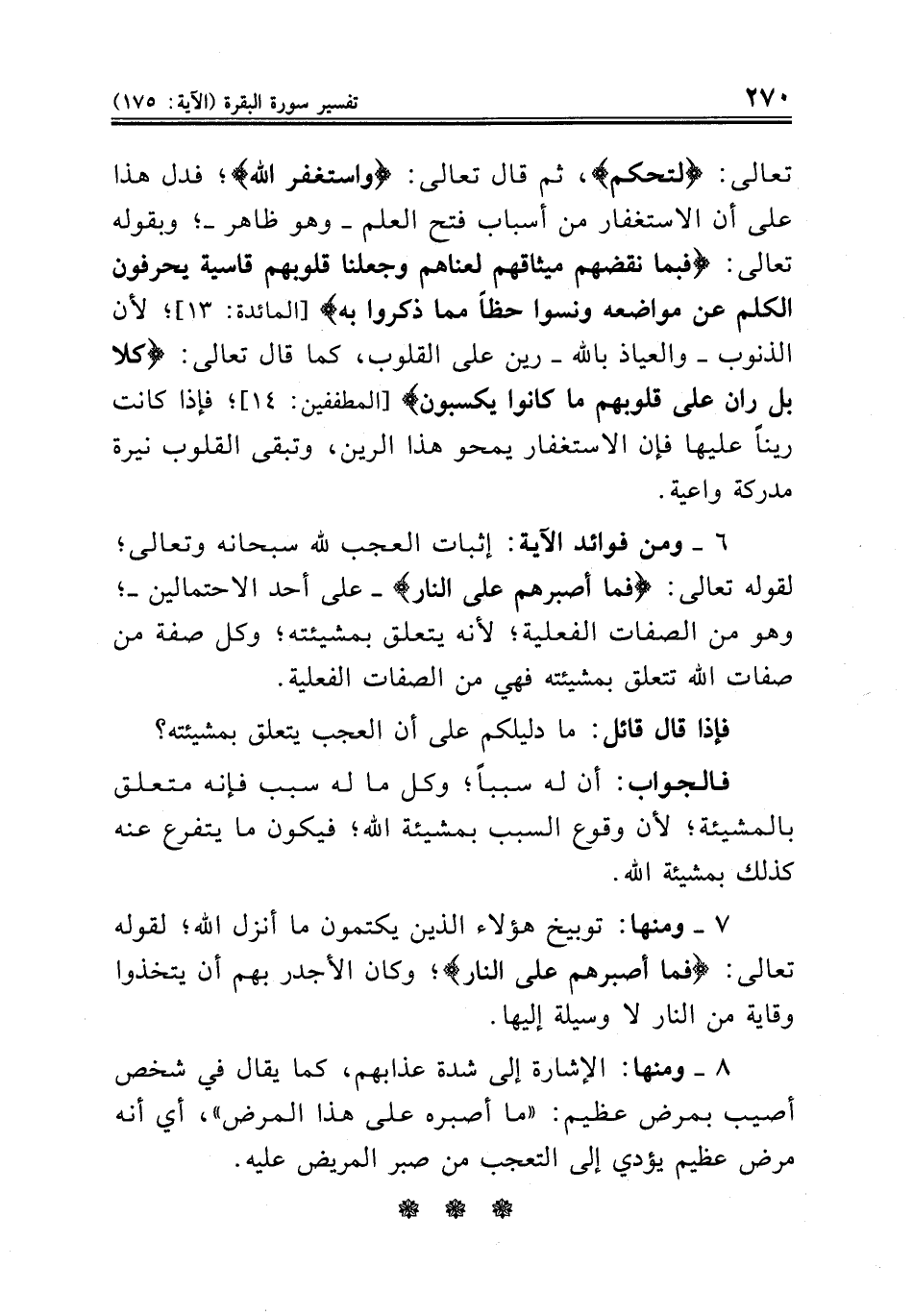٦ ــ ومن فوائد الآية: إثبات العجب لله سبحانه وتعالى؛ لقوله تعالى: {فما أصبرهم على النار} ــ على أحد الاحتمالين ــ؛ وهو من الصفات الفعلية؛ لأنه يتعلق بمشيئته؛ وكل صفة من صفات الله تتعلق بمشيئته فهي من الصفات الفعلية.